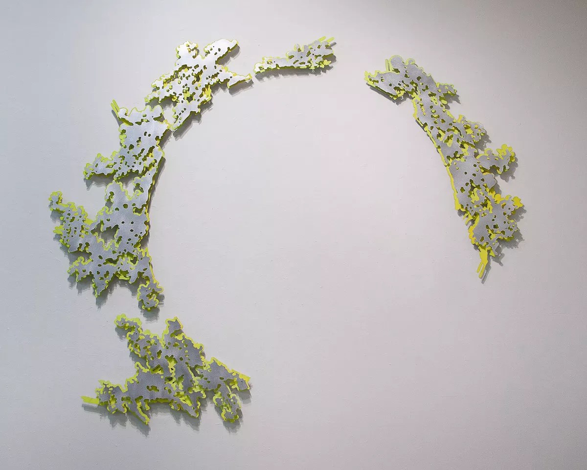 The last of the quintet of single-artist shows is Katy Stone: Transmissions, installed in the intimate viewing room. Stone sometimes works in laser-cut aluminum that’s been painted, and her forms have a naturalistic flavor, as though they were clouds, topographical lines or flames. They are set out from the walls so that the shadows they cast with their irregular profiles become major components of the compositions. One of the most ambitious is “Corona,” in which a circle representing the sun is partly described by Stone’s rendition of flames rising off the surface of the fiery sphere. These flames are conveyed through a two-layer construction, with a complex set of jagged shapes painted yellow against the wall and smaller though similarly shaped elements left in polished aluminum mounted on top of that. The top layer is pierced, so that you can see the yellow structure underneath in places.