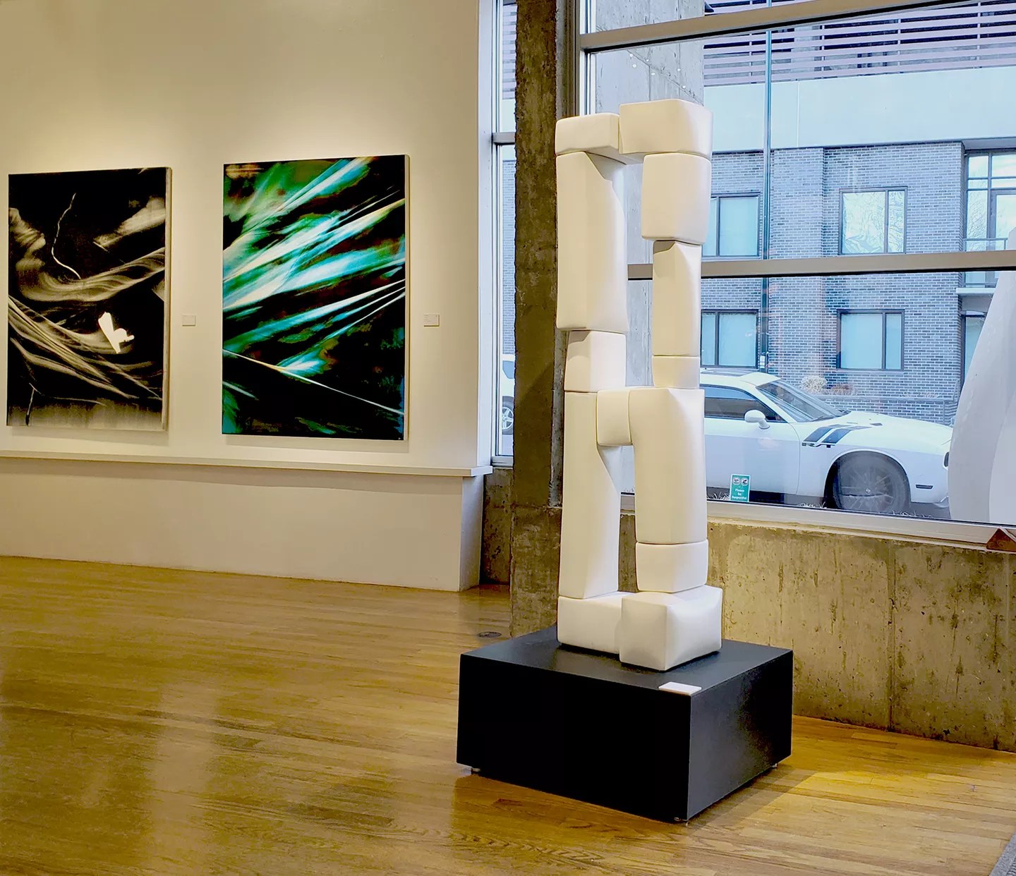 Emmett Culligan’s steel-and-marble sculpture “Rubric 1B,” with Ryan Magyar paintings in the background.