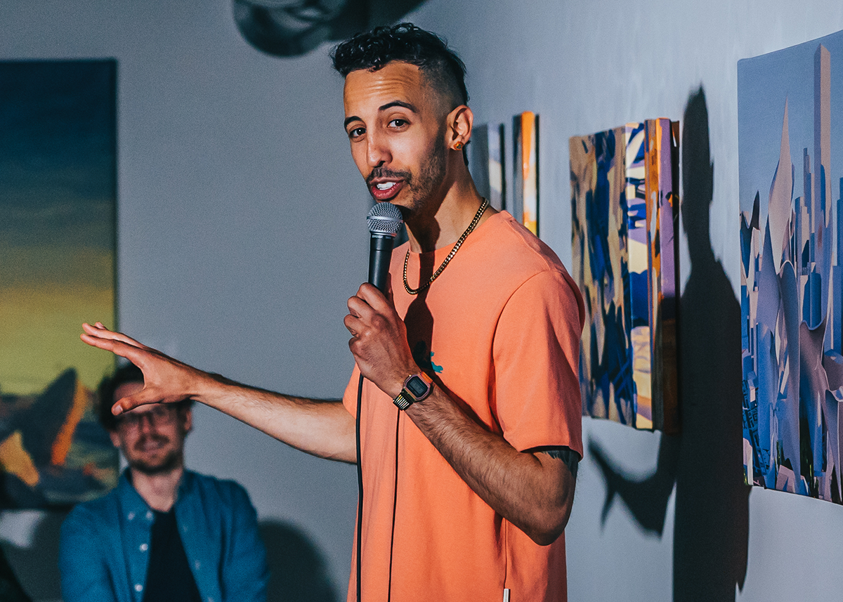 “There’s a certain imaginary barrier: ‘Oh, I won’t get it…that’s not for people like me.’ I want to change that, and I think the best way to do it is through comedians. Comedians are often kind of like jesters. It’s kind of like we’re seen as the dumbest people, so we can go, ‘That painting reminds me of my own butt,'” he says with a chuckle. “And people are like, ‘Well, if this guy’s talking about his butt, looking at this painting, I could probably go over there and wonder something or hang out with my friends.'”