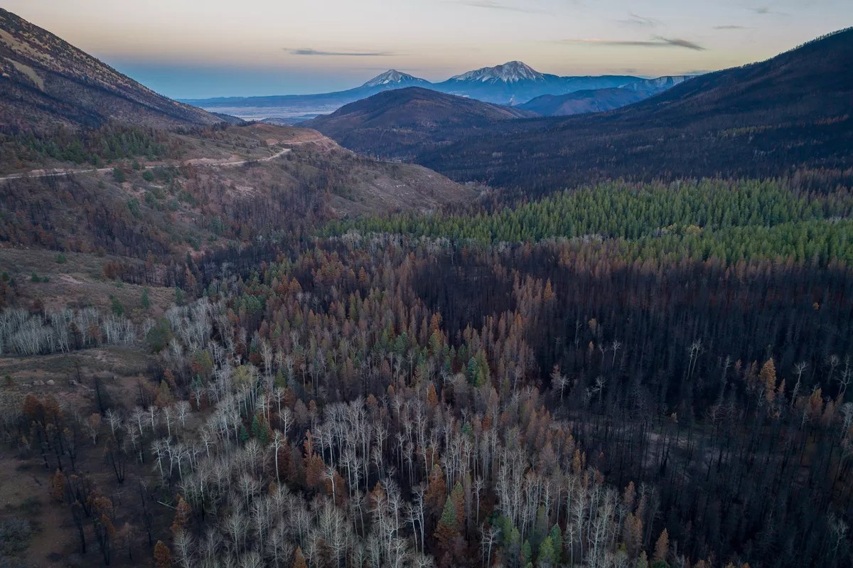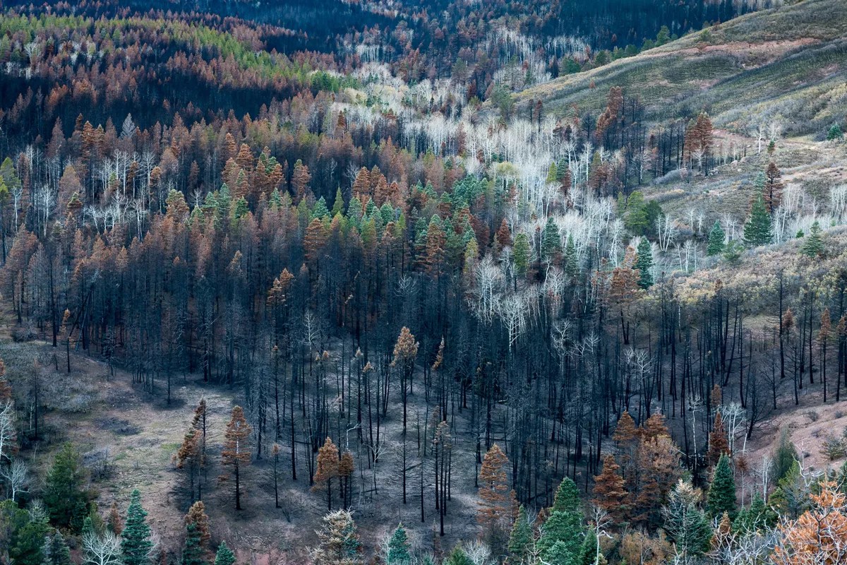 Though the Anderman photos are in full color, the shots dominated by stands of burned-out trees almost read as though they were done in black and white, until you notice a little rust color around the edges. In others, the damage is partly hidden by the beauty of what’s been spared by the flames and the hills and mountains beyond. Perhaps most breathtaking, though, are the photos in which the winding path of the fire can be seen going through otherwise healthy woods, most strikingly in “Spring Creek [10/21/18, #85], La Veta Pass, CO.” In this photo, the foreground is charred, filled with blackened tree trunks, but beyond are ribbons of still-verdant evergreens punctuated by the ghostly white branches of the dead aspens. The combination of colors gives the landscape a tapestry-like character, with the different shades weaving in and out of each other.