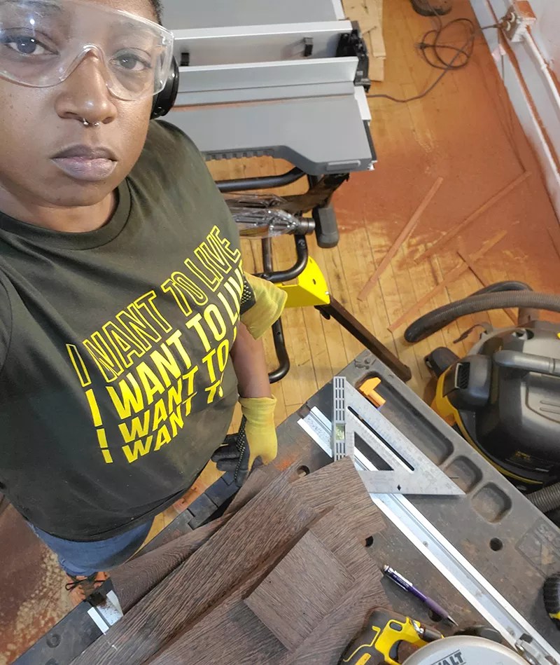 There are several community spaces available, few of which are appropriate for woodworking and machinery. Shared woodworking spaces are available but also pretty uncomfortable for me. I have faced a lot of bias simply because I am a Black woman working with wood and tools, and the assumption is that I need help, when in fact, most often I do not. My goal in the next year is to find a private studio space that is coded for woodworking and is affordable and safely accessible.