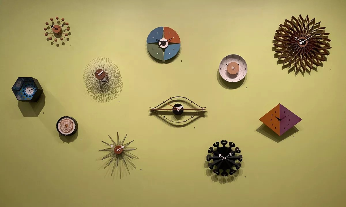 The term “midcentury modern,” which is a very popular brand right now, has taken on a catch-all quality, with a wide range of disparate styles shoehorned into the same category. I’ve even seen it used to describe 21st-century creations, despite the fact that it clearly refers to the middle of the 20th century. On one end of a true midcentury sensibility is elegant naturalism; on the other is chic industrialism, with innumerable permutations somewhere in between – and beyond – these two. Even when the art, architecture and design of the 1950s to the 1970s was brand-new, the sensibilities that inspired things like abstract expressionism, Usonian architecture, functionalist design and on and on seemed to represent a significant cultural moment in American history. In one field after another, the United States had supplanted Europe, devastated by the war, as the world’s aesthetic leader. In this country, newly affluent citizens, weary from the dreariness of a decade of the Depression followed by the war years, readily embraced modernism. A selection of clocks by Irving Harper for George Nelson Associates in Serious Play. Courtesy of the Denver Art Museum