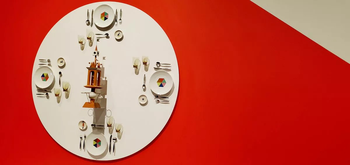 A table setting designed by Alexander Girard, mounted vertically on the wall for Serious Play.