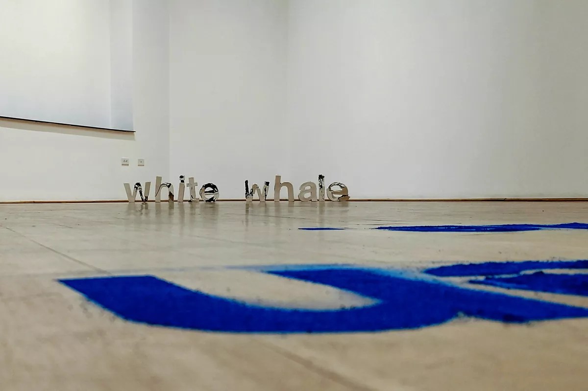 In addition to the group show, Michael Warren is hosting a solo, White Whale: New Works by Thomas Müller. A Los Angeles-based artist who was born in South Africa and raised in Seattle, Müller is interested in temporality, language and objects, and all three appear in these installations. Impermanence is definitely a key component in the floor piece “the space between us is vast and unfathomable,” as is language. The sentence-length title is printed out across the floor, each letter done in cobalt-blue powder left in its loose state. If someone walked across it – which is likely, since the piece is next to the entry to the space – it would be completely destroyed. (After seeing it in early April, I asked McClung how it had survived First Friday; he said he’d cordoned off the entire back gallery to prevent people from entering.)