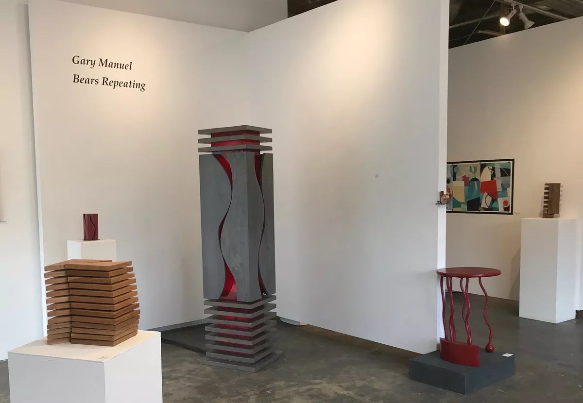Just a block away on Santa Fe, Spark is hosting three solos by members: Bill Ballas: Works on Paper, Canvas and Board, Gary Manuel: Bears Repeating and Alicia Bailey’s This Time Is…. Ballas and Manuel decided to exhibit together, combining the east and west galleries into one big space where painter Ballas has taken over the walls and sculptor Manuel the floors. Though their works are totally unrelated – Ballas creates maze-like constructivist abstractions, while Manuel does sculptures in wood and metal that have the feel of furniture – they work well together. The Bailey show, in the tiny north gallery, spotlights her lyrical artist books that combine imagery and text.