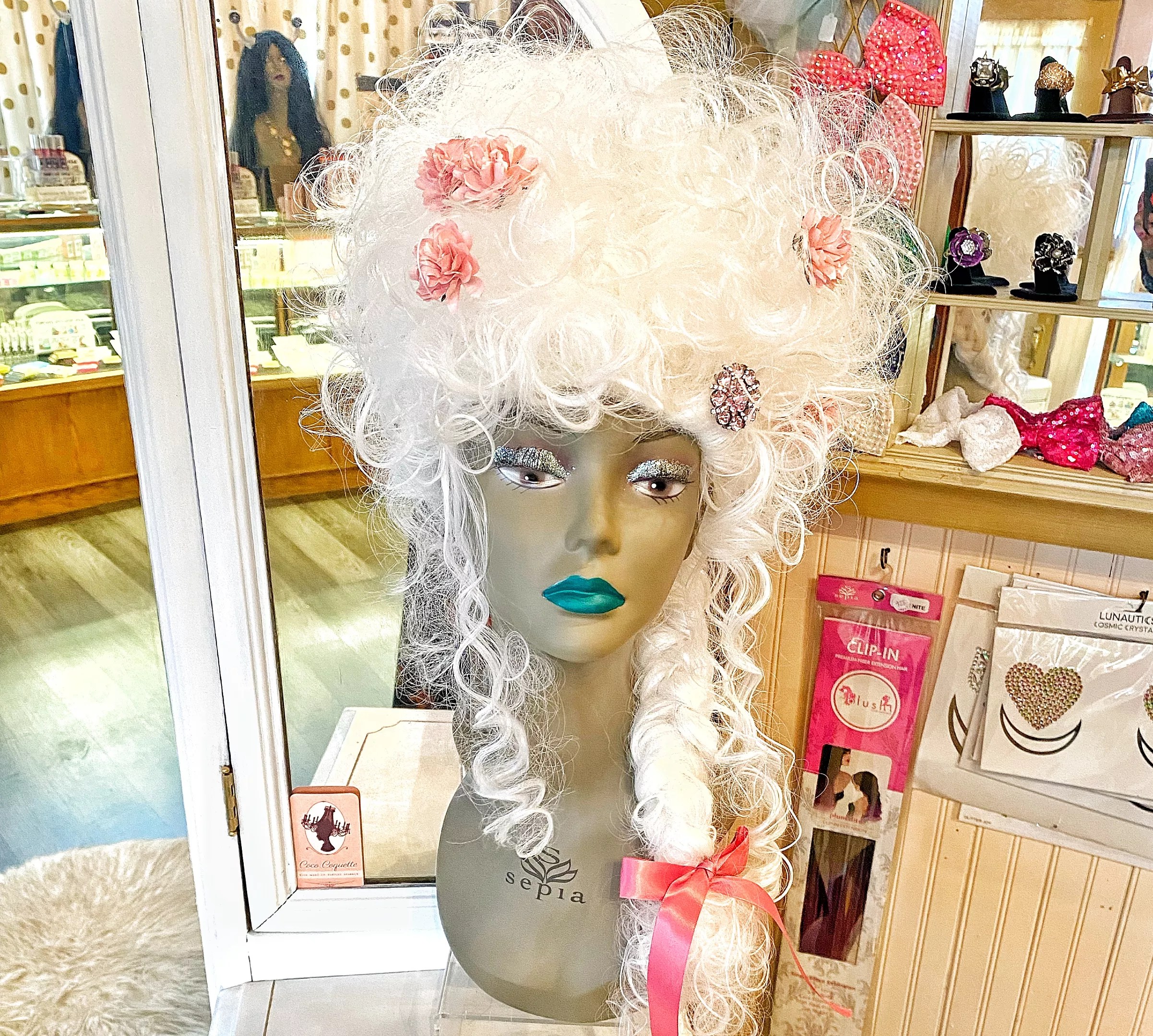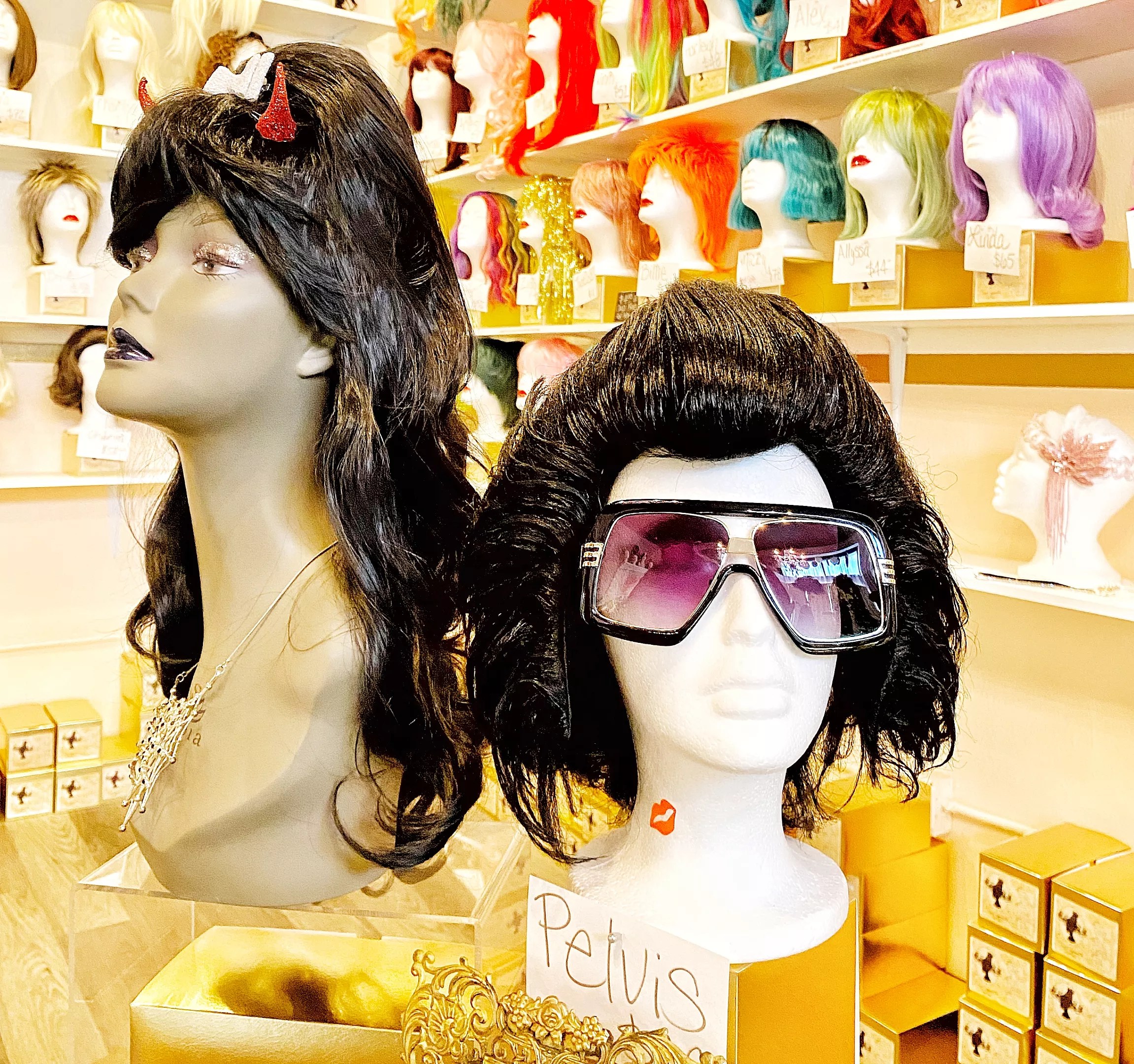 Heather Dawn: We do wigs, makeup, all things sparkly, accessories, cosmetics. People are usually like, “What’s a wig party?” It’s a private party booked by a group, and you will have the entire place to yourselves after hours. You can bring in food and drinks, we help you find a wig of your choice, and once you find your wig, we send you to the makeup magician. Everyone leaves looking really fly.