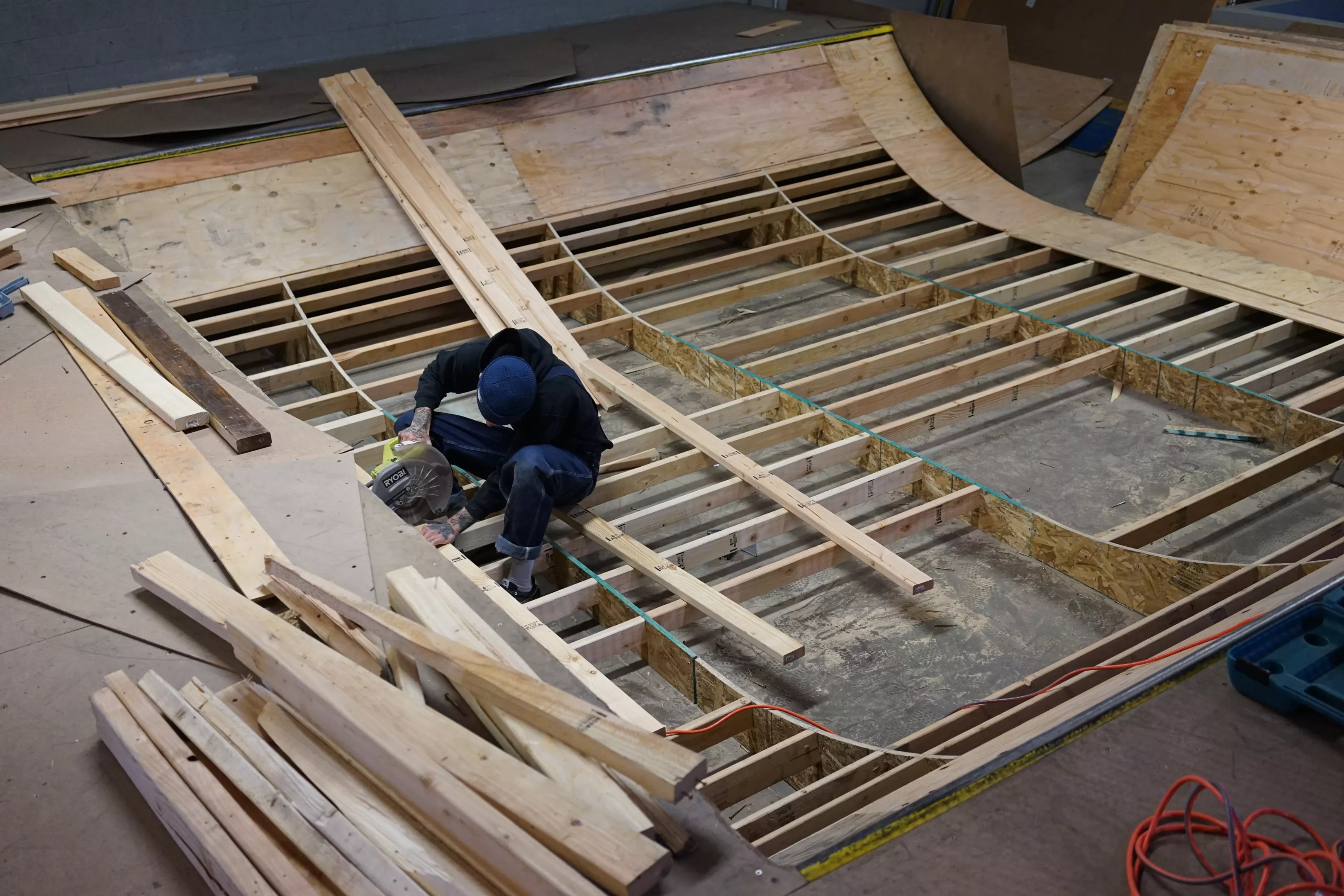 Michael Penhale building a mini-ramp.