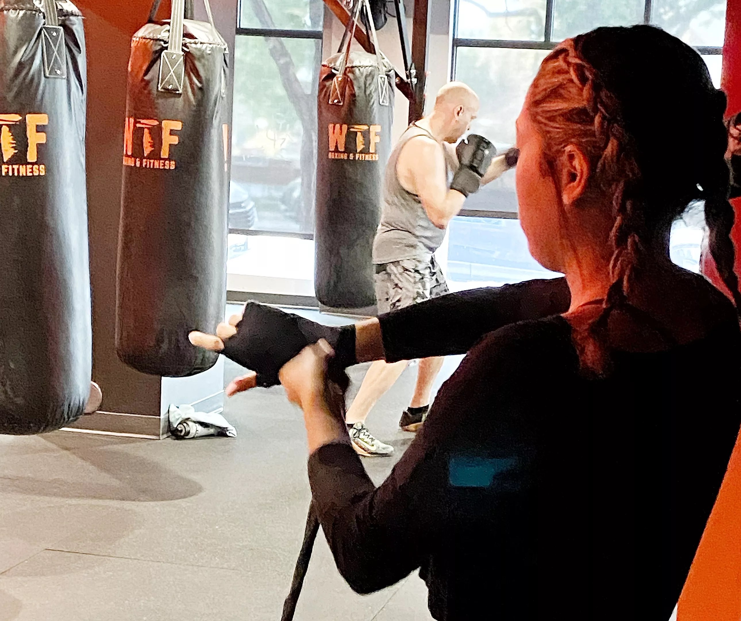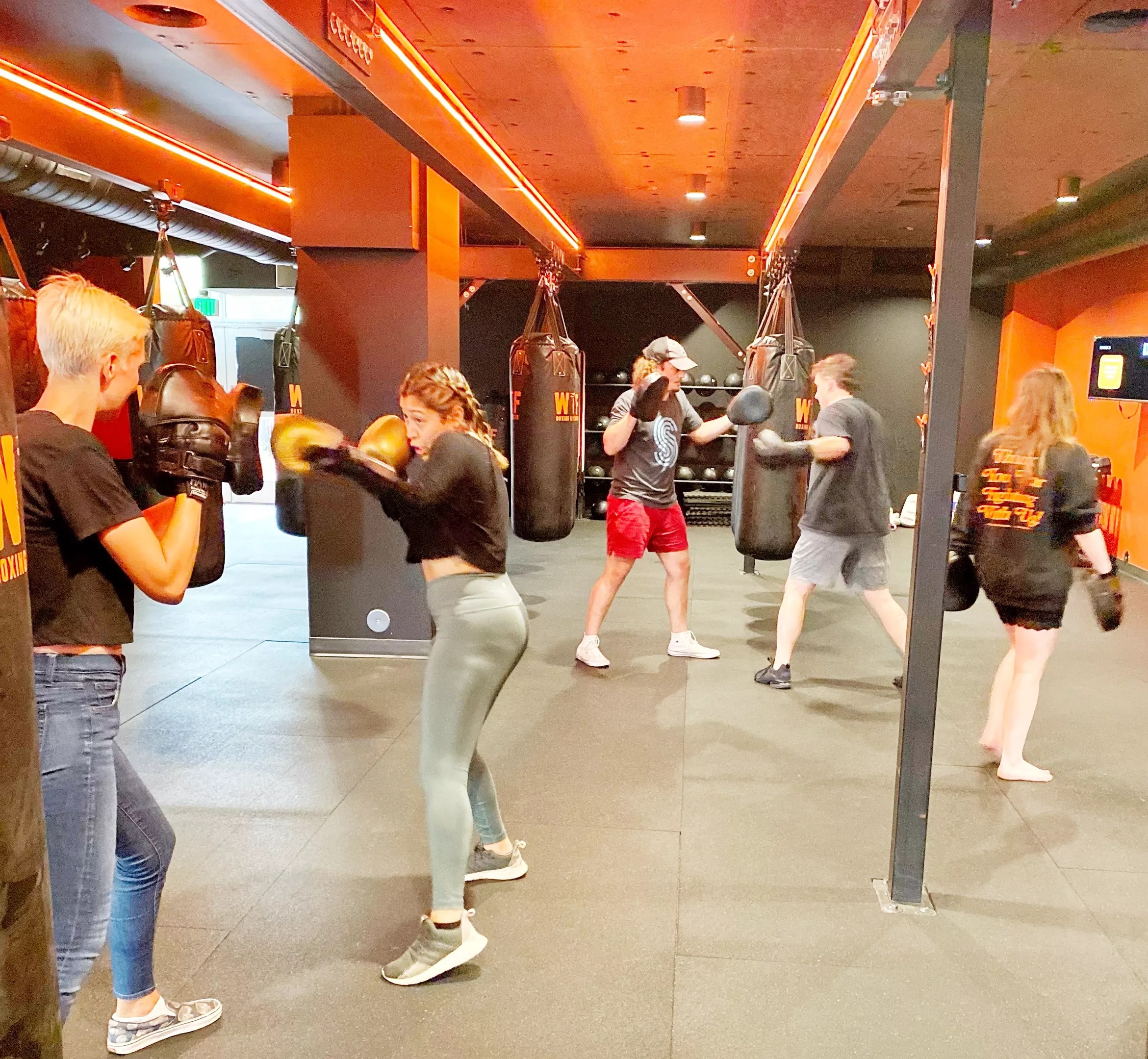 The first thing you notice upon entering the space is that it is spotless, a point of great pride and intention for Santiago. It’s also a little dark, with glowing red lights all along the steel beams that house the punching bags, each branded with “WTF.” The giant bags are on tracks, which allows for flexible setups that adapt to each class.