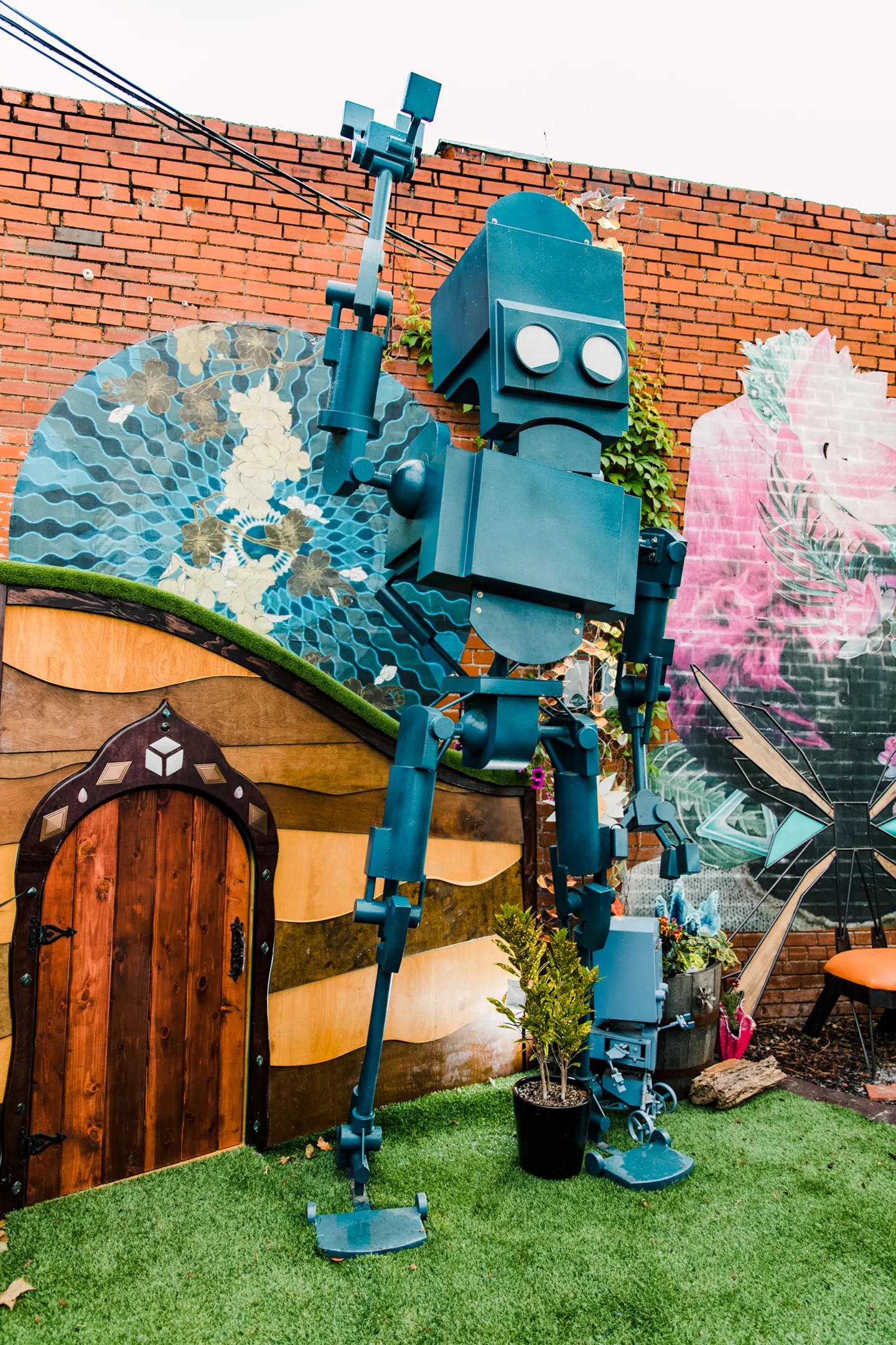 On a hot July morning, a giant robot creates a welcome patch of shade next to an inviting hobbit hole. The small, curved door leads into a little house, where lights pulsate kaleidoscopic images through a mirror. Framed butterflies line the walls alongside even smaller dwellings, including a little house with a Dolly Parton poster. Inside a diminutive silver box is a message written on a teeny-tiny folded paper: “They know the old ways. Something the elders don’t know. No, some things are deeper than knowledge, evolution is required.”