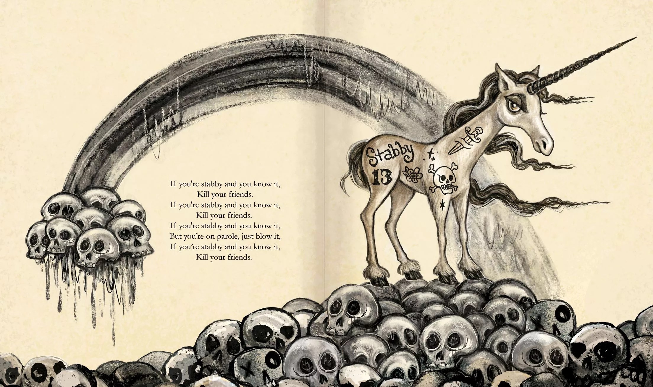 Stabby was born with Windness’s first graphic novel, Mother Goth Rhymes (Hermes Press, 2019). The novel included a poem titled “If You’re Stabby and You Know it, Clap Your Hands,” with an accompanying image of a unicorn with black horns, tattoos and a disapproving glare standing on a mountain of skulls. The image was used as a banner for Windness’s Rhymes booth at the San Diego 2019 ComicCon, and quickly became a fan favorite.