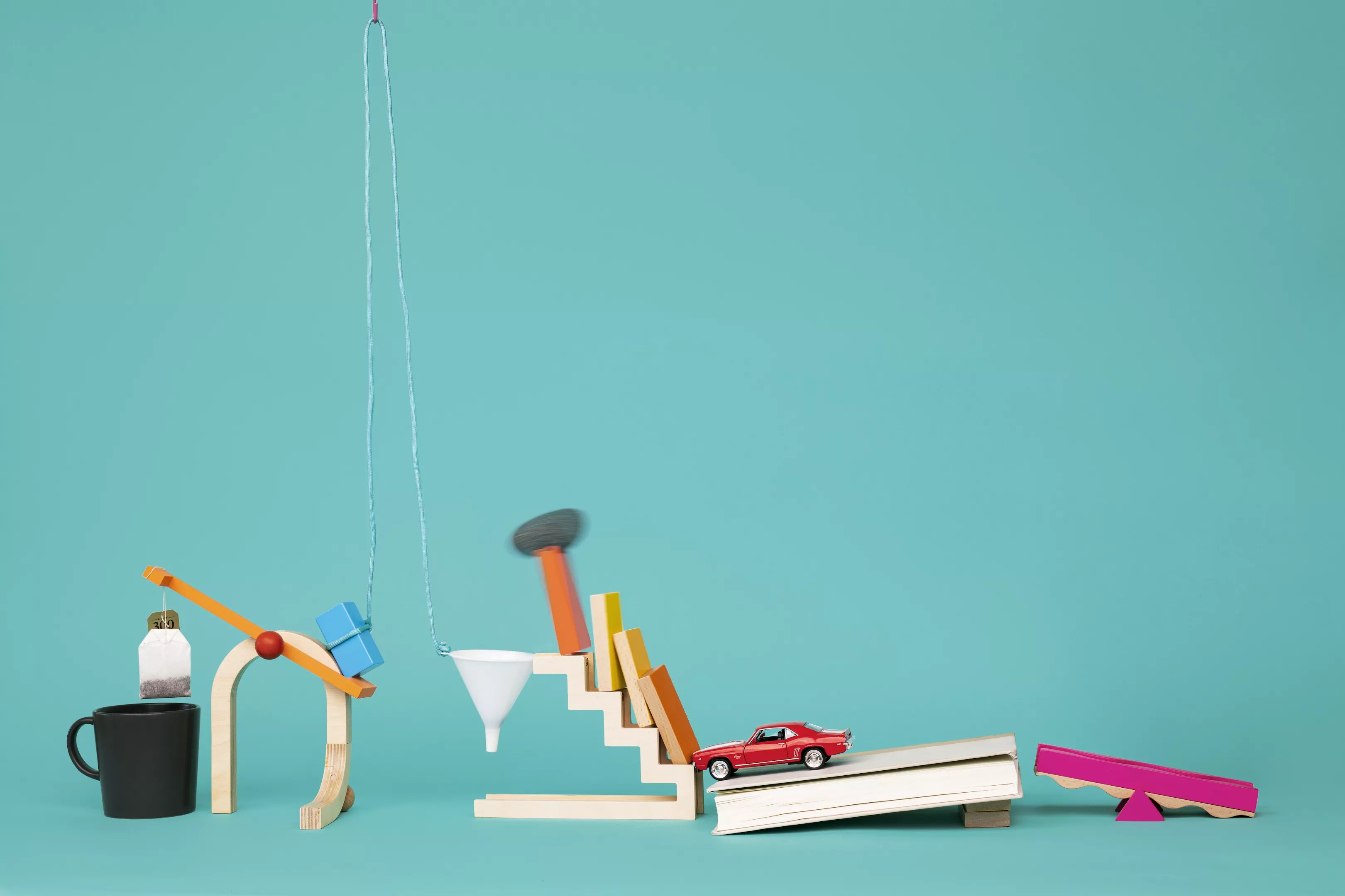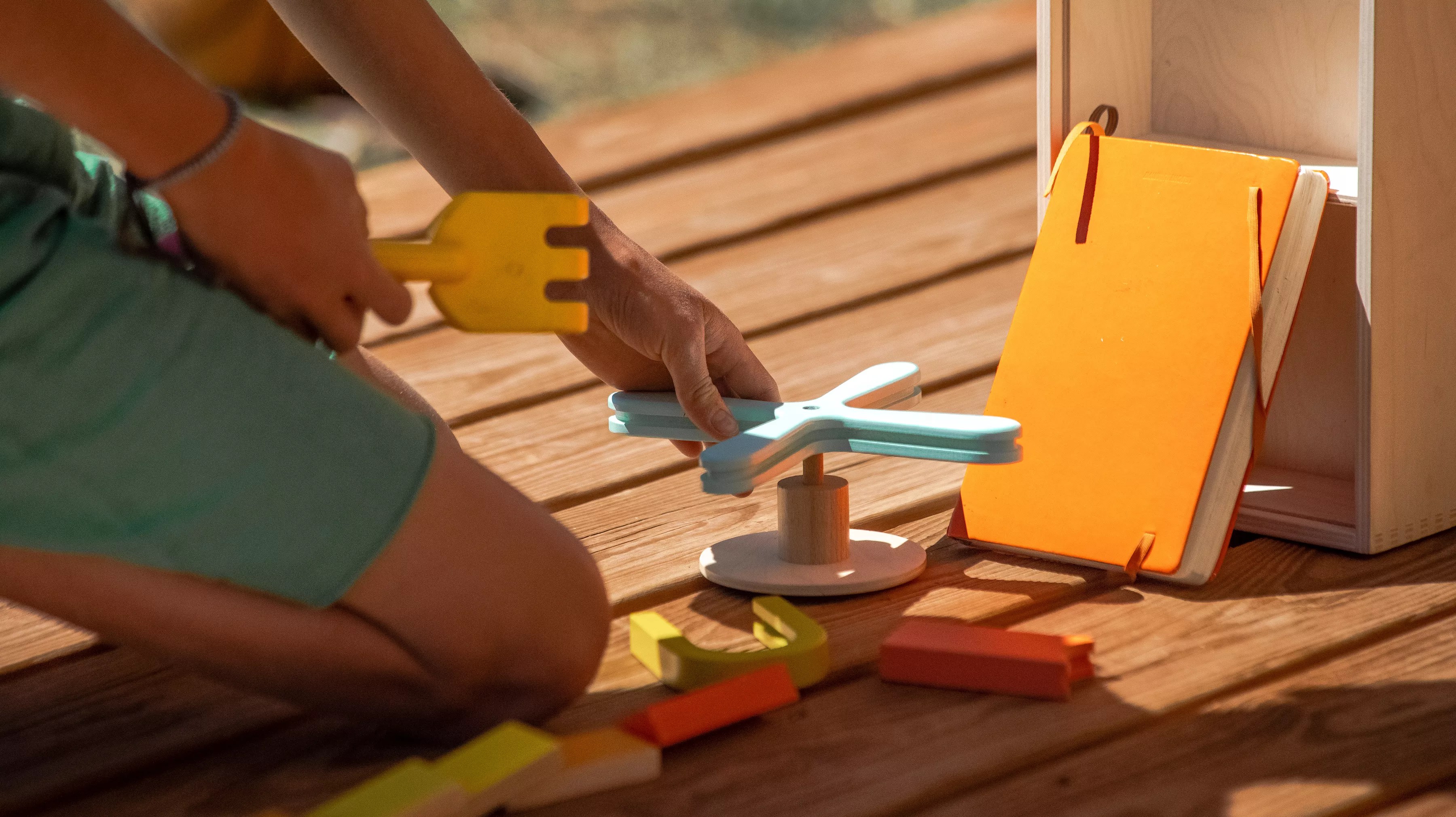 The result was Momentix motionKit, a wooden toy set designed for all ages that allows for experimentation with common household items. With the toy pieces, you can make dominoes fall without using your hands or flip a spoonful of sugar into a mug. In the process, the Momentix motionKit emphasizes creative problem-solving and other skills.