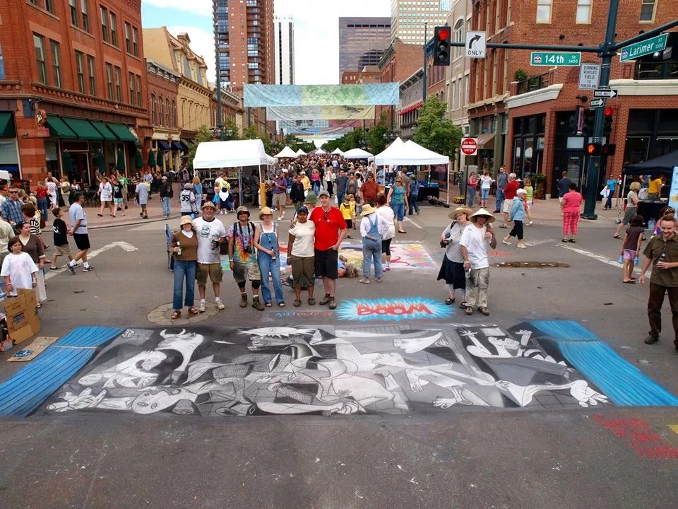 Gordon’s electric brainstorming style aided his collaborations when it came to music, another area where he was self-taught. Whether in music or in art, from drawing chalk paintings on the sidewalk to improvising on homemade instruments or building out a space, his excitement was infectious and his ideas were great. He was one of the longest-running participants in the Denver Chalk Art Festival at Larimer Square, winning the grand prize directing members of Boom with a rendition of Picasso’s “Guernica” in 2008.