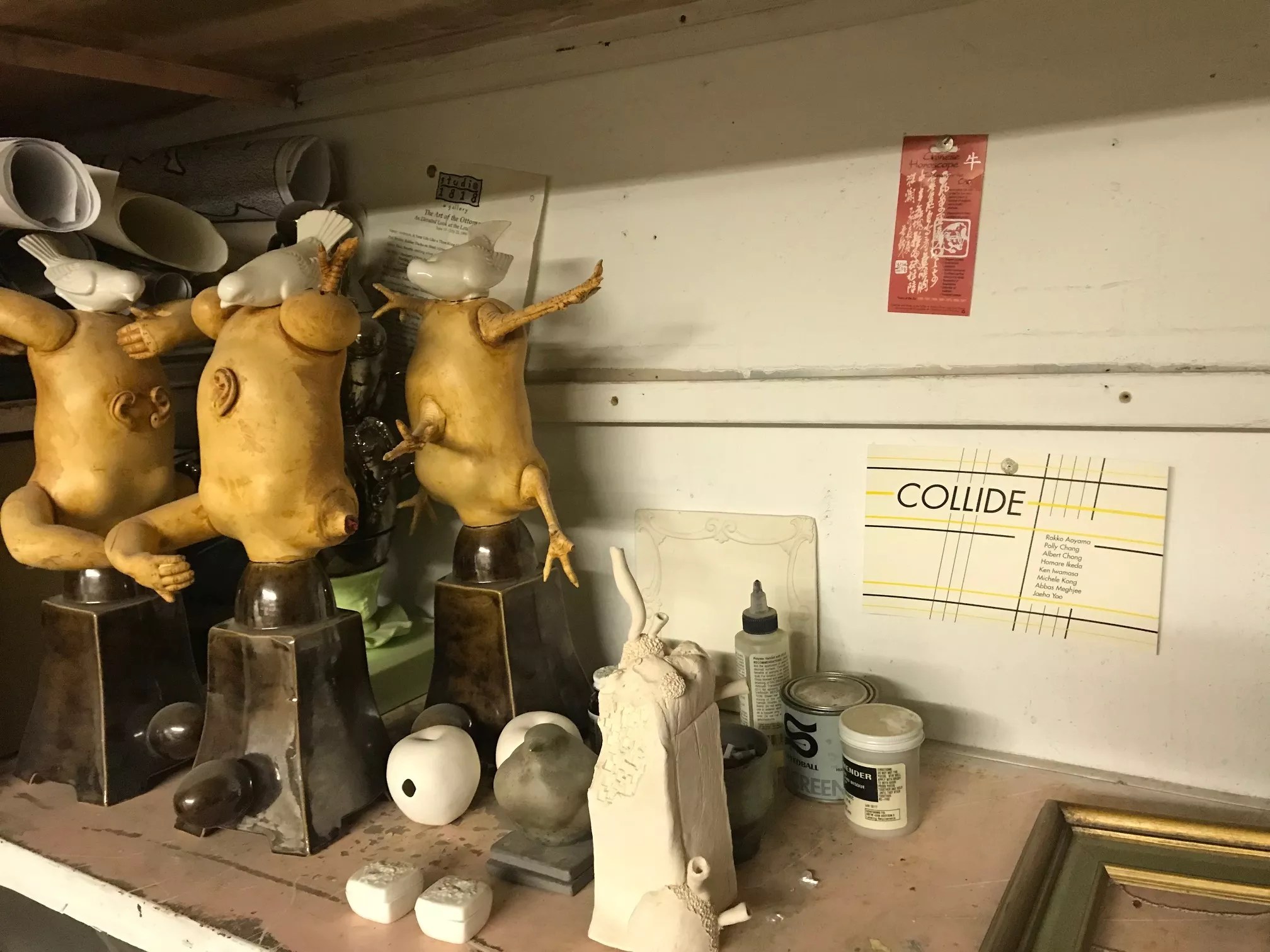 The fluid exchange of ideas and techniques in a studio building is a given. In Gordon’s case, his spirit of learning everything there was to learn had him branching from the illustration and gold leafing he honed in his professional life to the ceramics techniques that many of his studio-mates engaged in. The motherlode came when Mile High Ceramics offloaded a ton of kitschy ceramic slip-molds, including a collection of cherubs and teapots, inspiring a cut-together aesthetic of towering, lustre-glazed “trophies” that were a brilliantly twisted mashup of a suburban grandmother’s china cabinet. Later, he would use flowered decals and humorous phrases to create vintage-inspired plates that could pass in a vintage shop, until you looked closer.