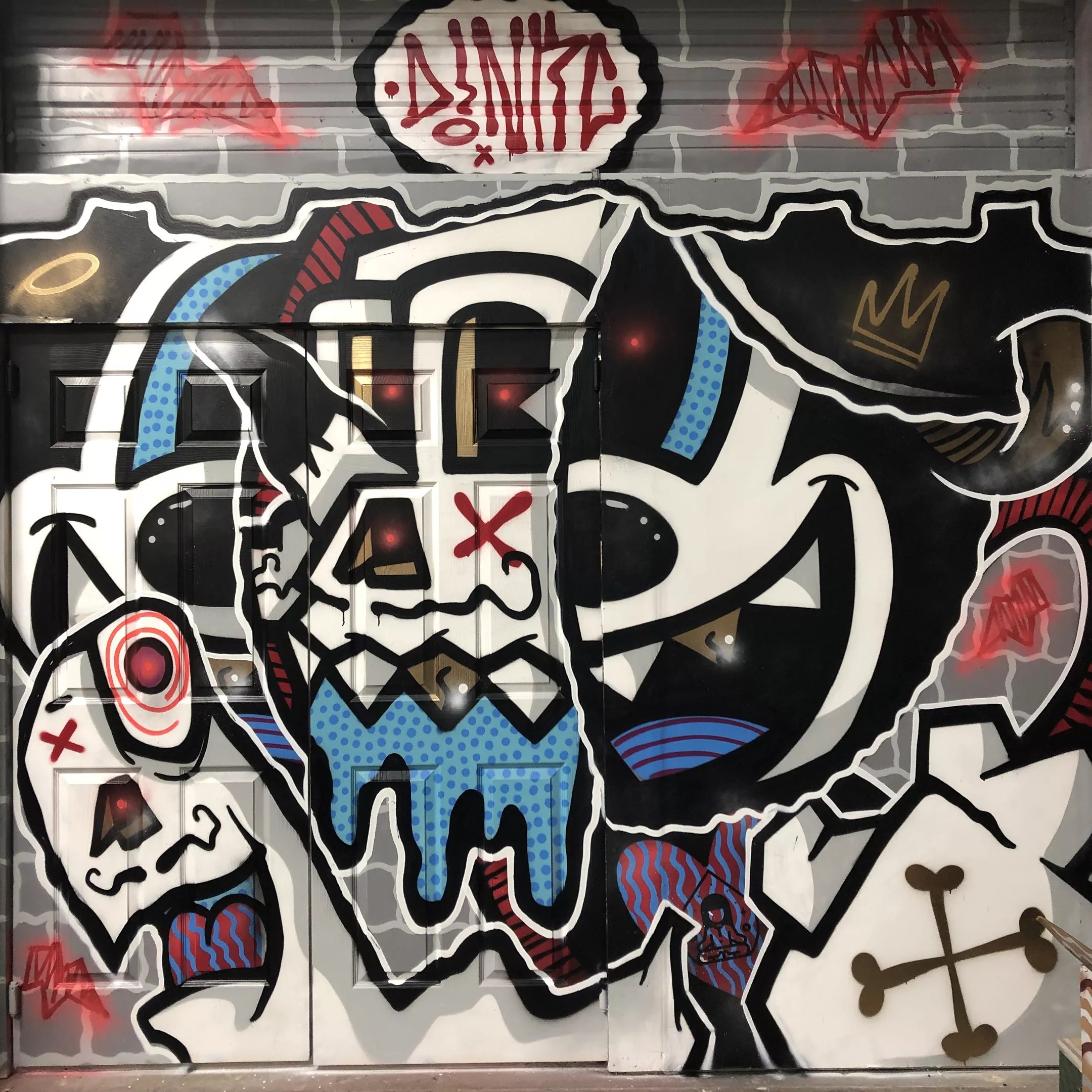 DINKC’s paintings are at once cheerful and dystopian, a mix of Mexican mythology related to Day of the Dead and inspired by his parents’ country of origin; hip-hop graffiti born from his friends, mentors and family in New York and Kansas City; and cartoony, Mickey Mouse-like figures. He often paints with bold black lines, a white background and a limited palette, creating images that are tough to ignore.