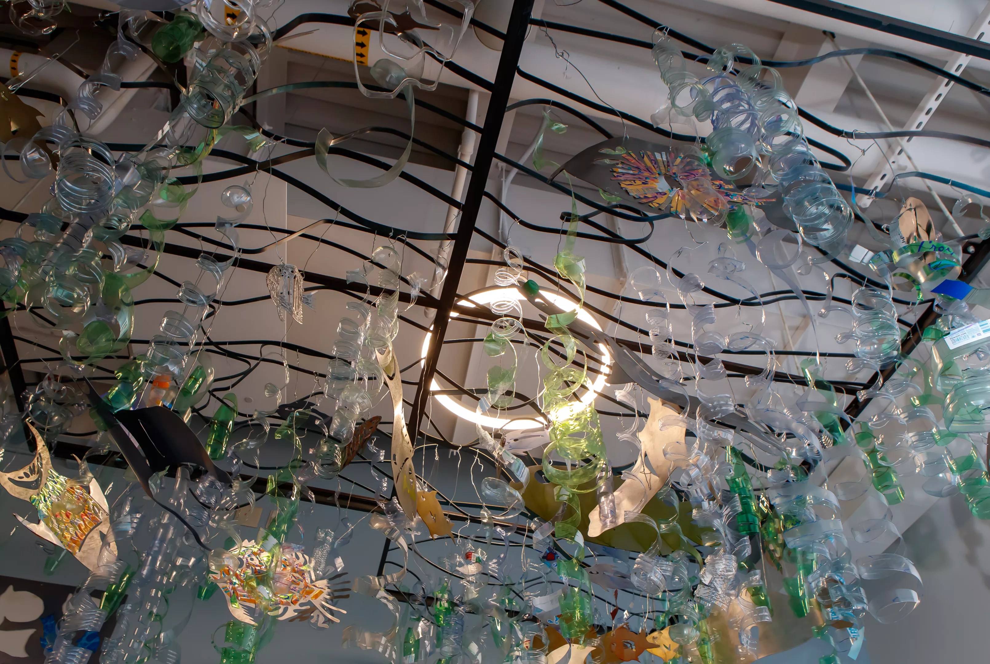 The students’ new sculpture – dubbed “Wire You Polluting?” – is large, nine feet by nine feet, comprising juxtaposed waves made of ornamental metalwork meant to represent the ocean’s surface. Below the waves, hanging from thin wires, are seaweed made from collected plastic bottles and swaying metal fish.