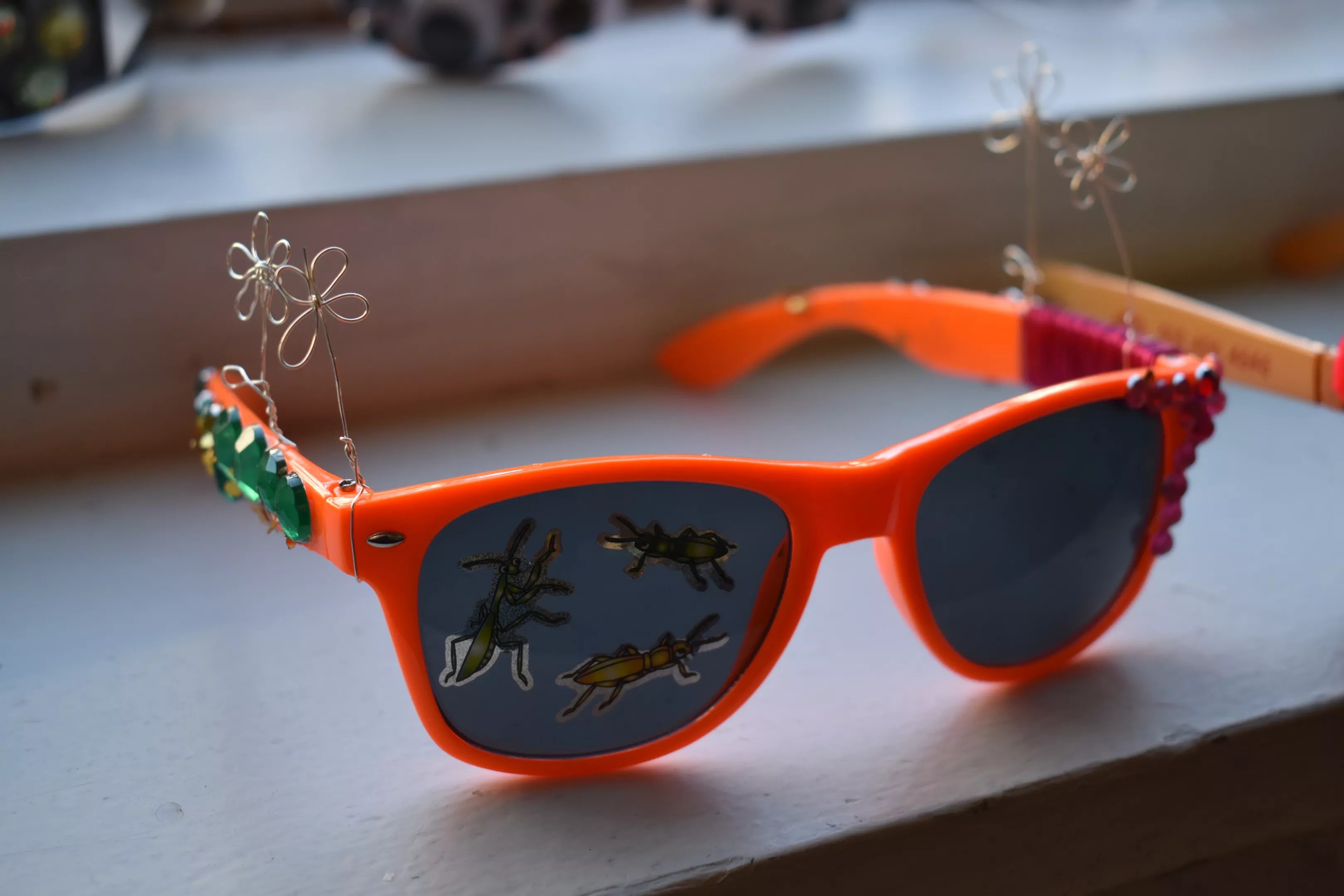 A pair of sunglasses customized with wire flowers by Jose Roman.