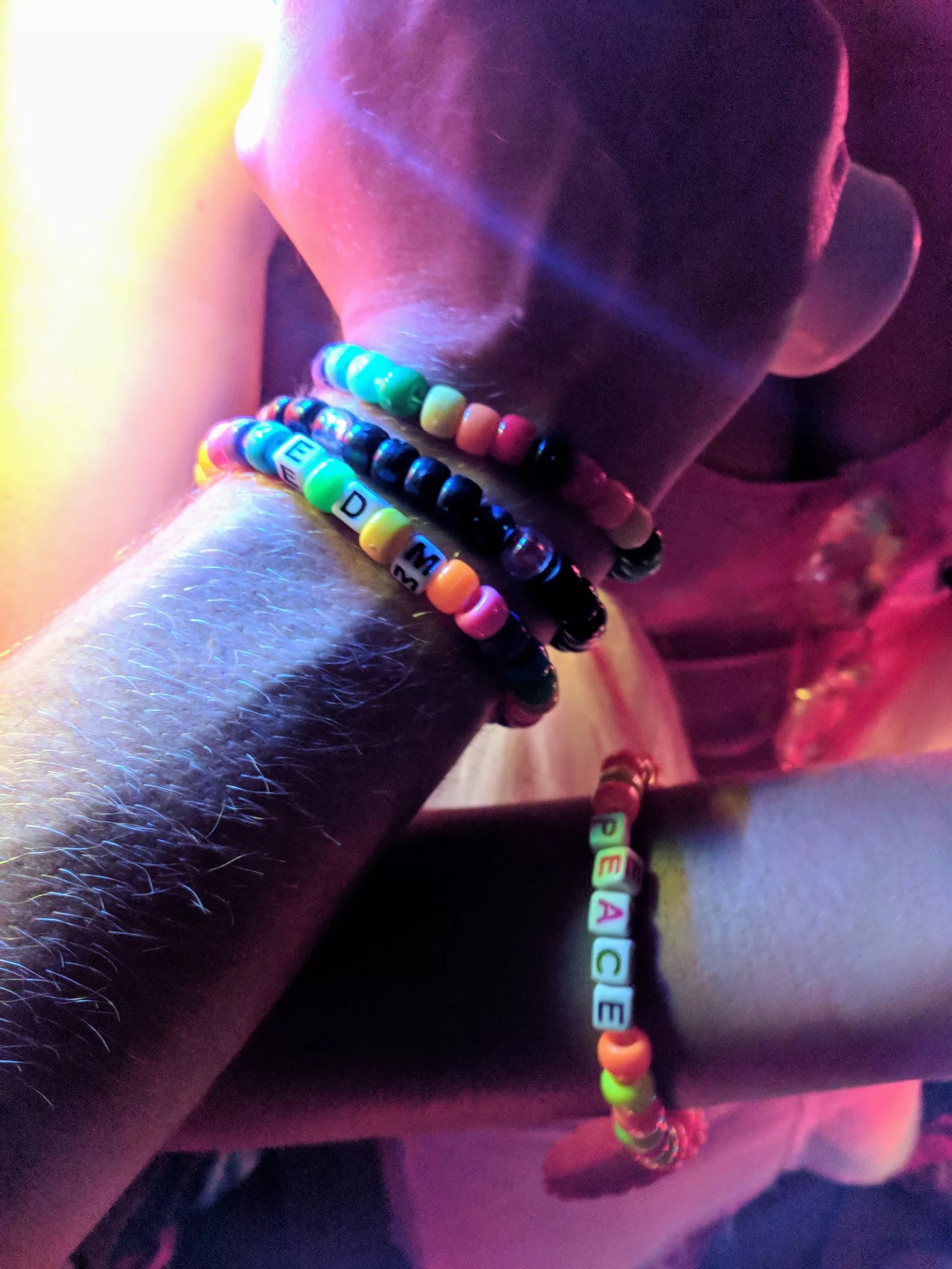 Colorful beaded bracelets, or “candy,” are a classic rave accessory.