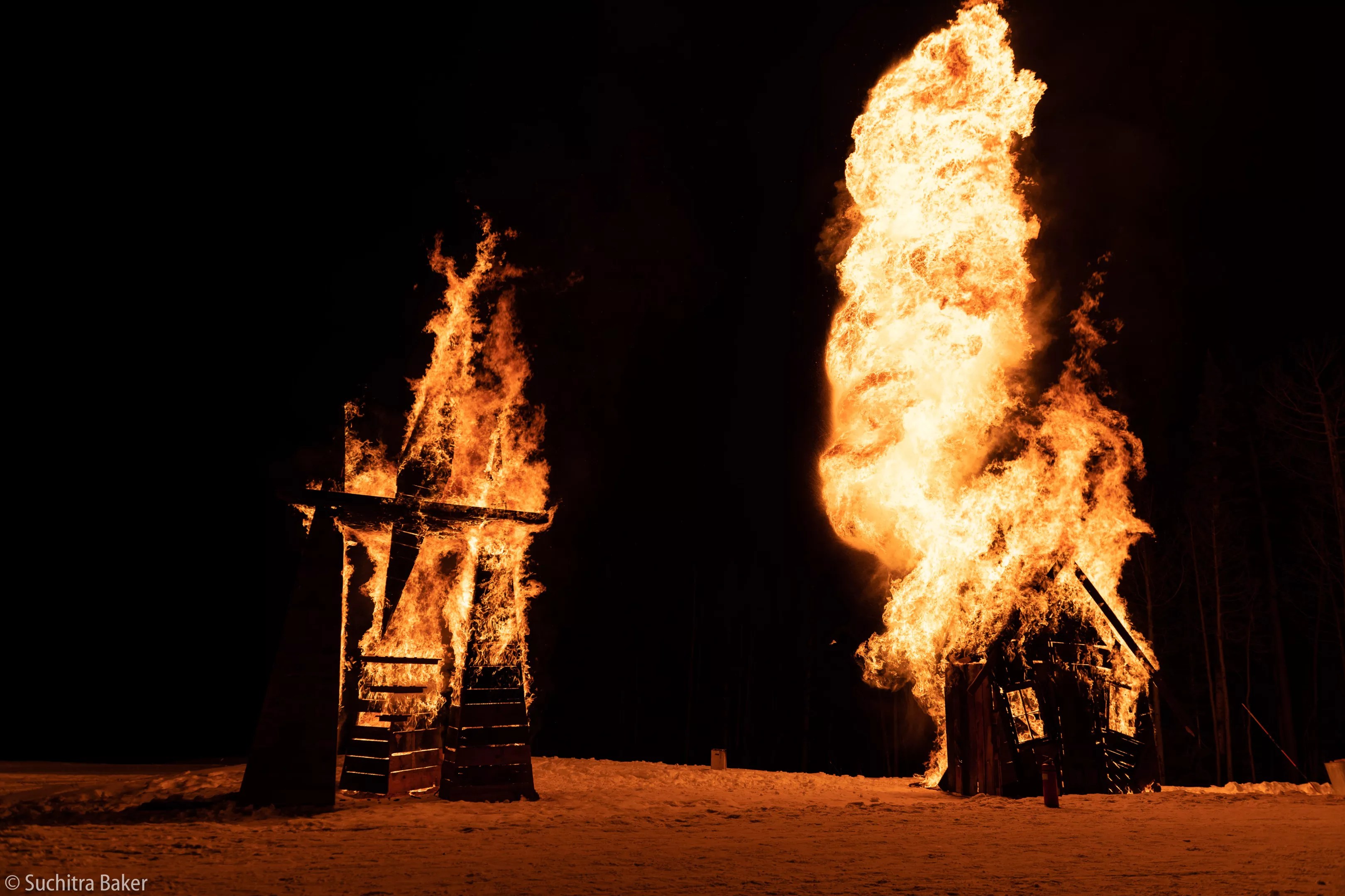 Wood sculptures burning in 2020.