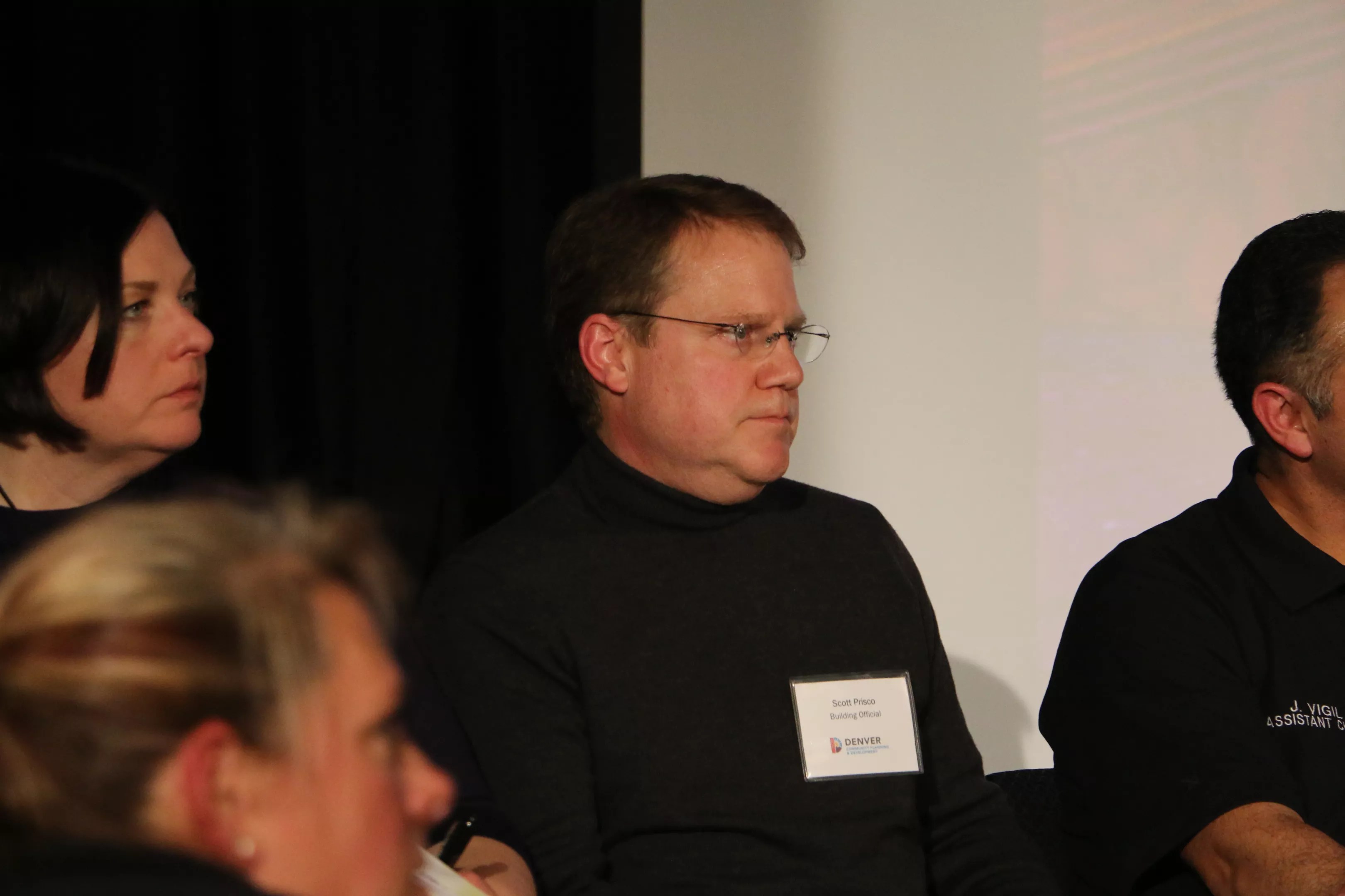 Scott Prisco, a building official with Denver Community Planning and Development, Jeremy Vigil, assistant chief of the Denver Fire Department, and Mark Rudolph, a fire department technician, listen as representatives from DIY advocacy group Amplify Arts Denver talk about why the DIY scene matters.