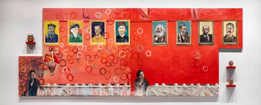 Hung Liu, “Modern Time,” 2005, oil on canvas with lacquered wood, cultural revolution clocks. (C) Hung Liu Estate/Artist Rights Society (ARS), New York