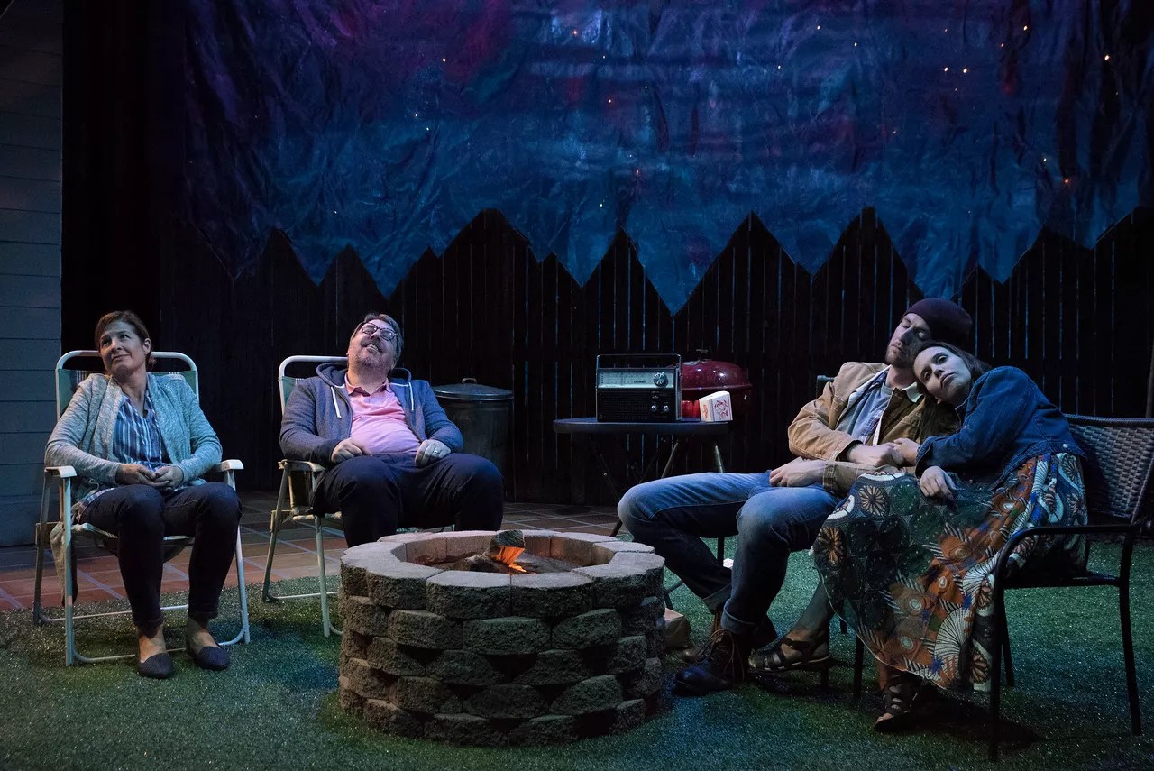 At the beginning of The Realistic Joneses, currently mounted by the Boulder Ensemble Theatre Company in a regional premiere, we do seem to be watching a realistic play. Bob and Jennifer Jones are seated in their garden, engaging in a conversation that signifies a complete lack of communication and understanding between them. Jennifer, smiling and appearing to revel in the peaceful garden, wants this communication, but surly Bob doesn’t. Or perhaps he does but can’t figure out how to do it. The two are soon joined by new neighbors John and Pony, also surnamed Jones. They bring a bottle of wine and all kinds of bright observations, but they’re completely daft – particularly pretty, flighty Pony.