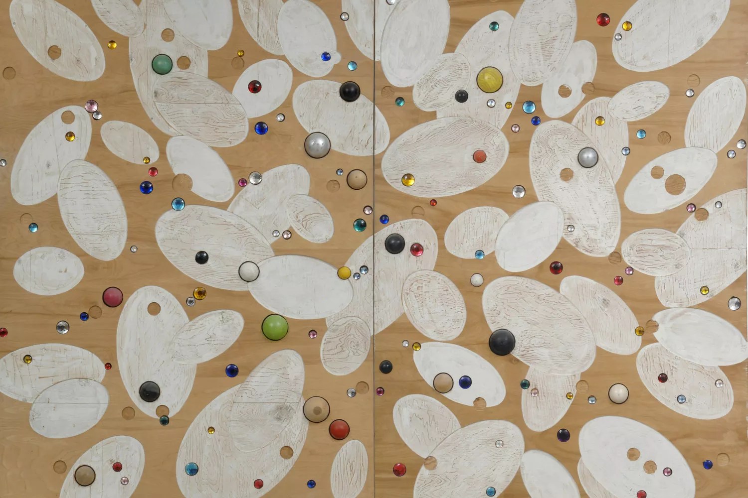John Torreano, “Swarm” (detail), 1990, enamel, wood balls and gems on two plywood panels.