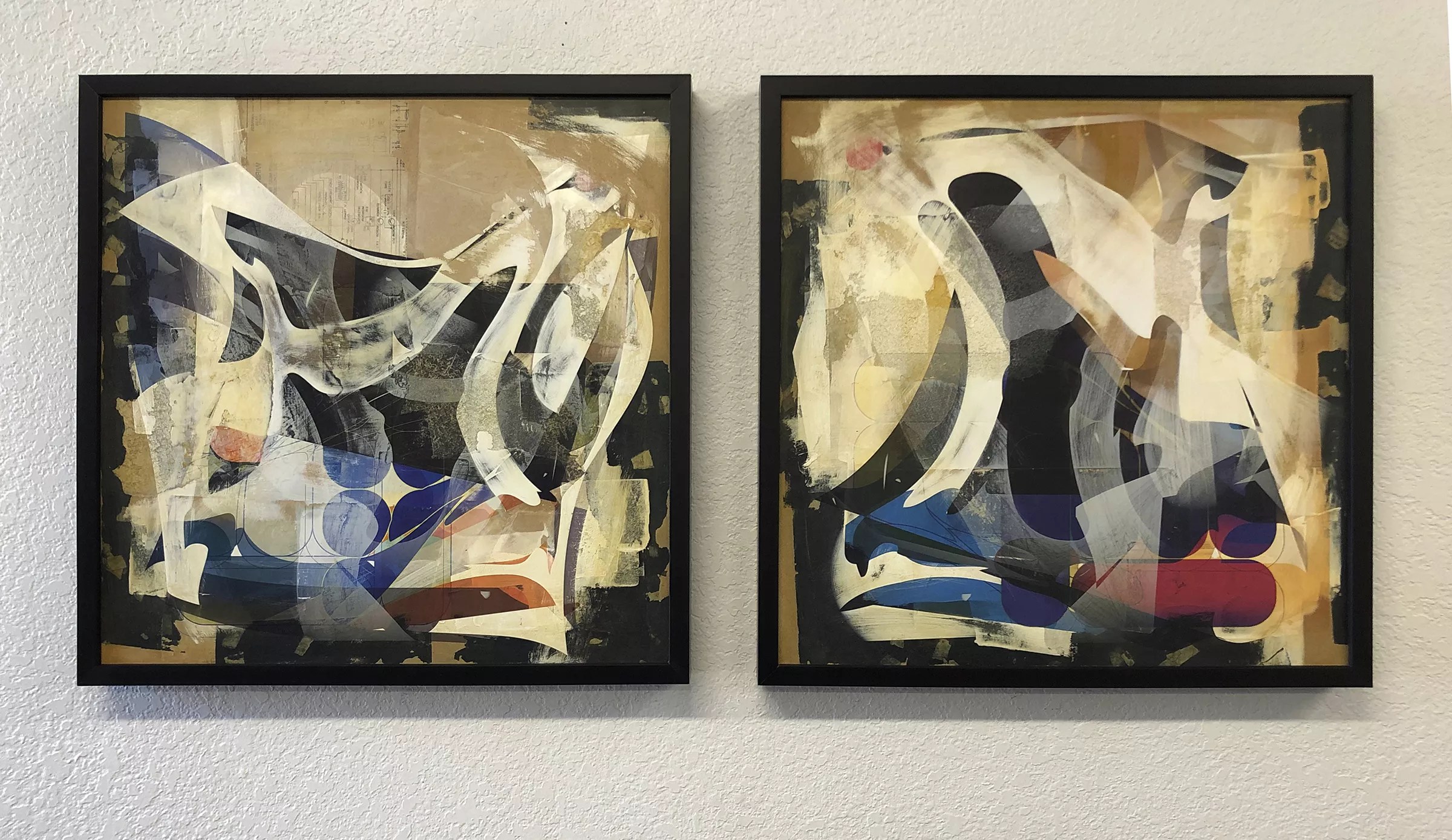 Katie Hoffman: Unsalable, and Clara Harbour: Location, Location, Location Chuck McCoy, “Left Out” and “Observed,” paper, paint and wax on panels with all-over inkjet printing. Chuck McCoy