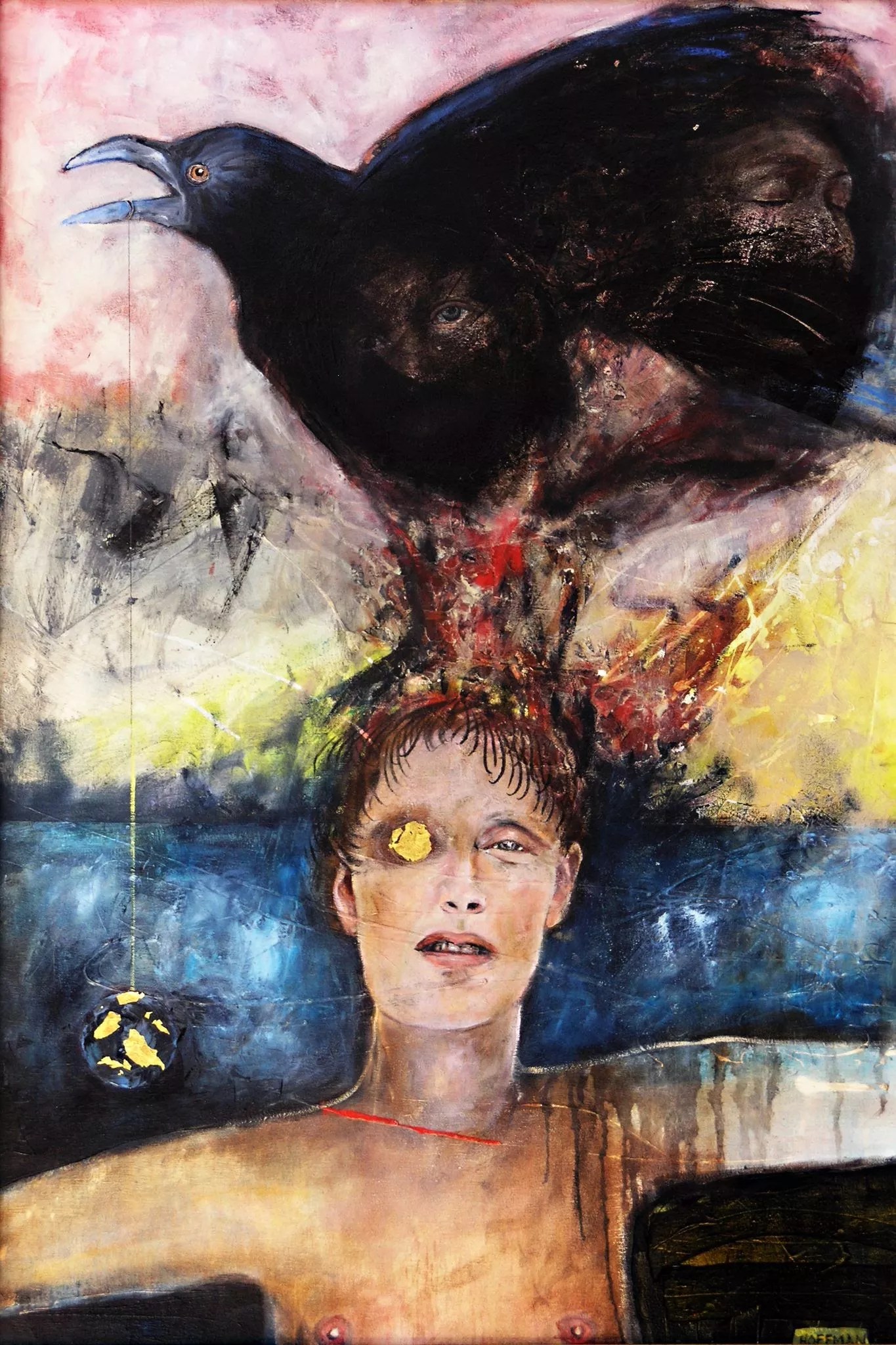 Katie Hoffman, “Not With a Bang but a Whimper,” oil and gold leaf on canvas.