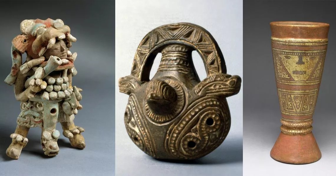 Gravity Waves “Jaguar-costumed Figurine Flute with Blowgun,” Mayan, 300-600 C.E., ceramic; “Decorated Ocarina,” 1000-1500 C.E., Costa Rica, ceramic; “Drum with Painted Geometric and Facial Imagery,” 900-1520 C.E., Chiriqui, ceramic. Courtesy of the Denver Art Museum
