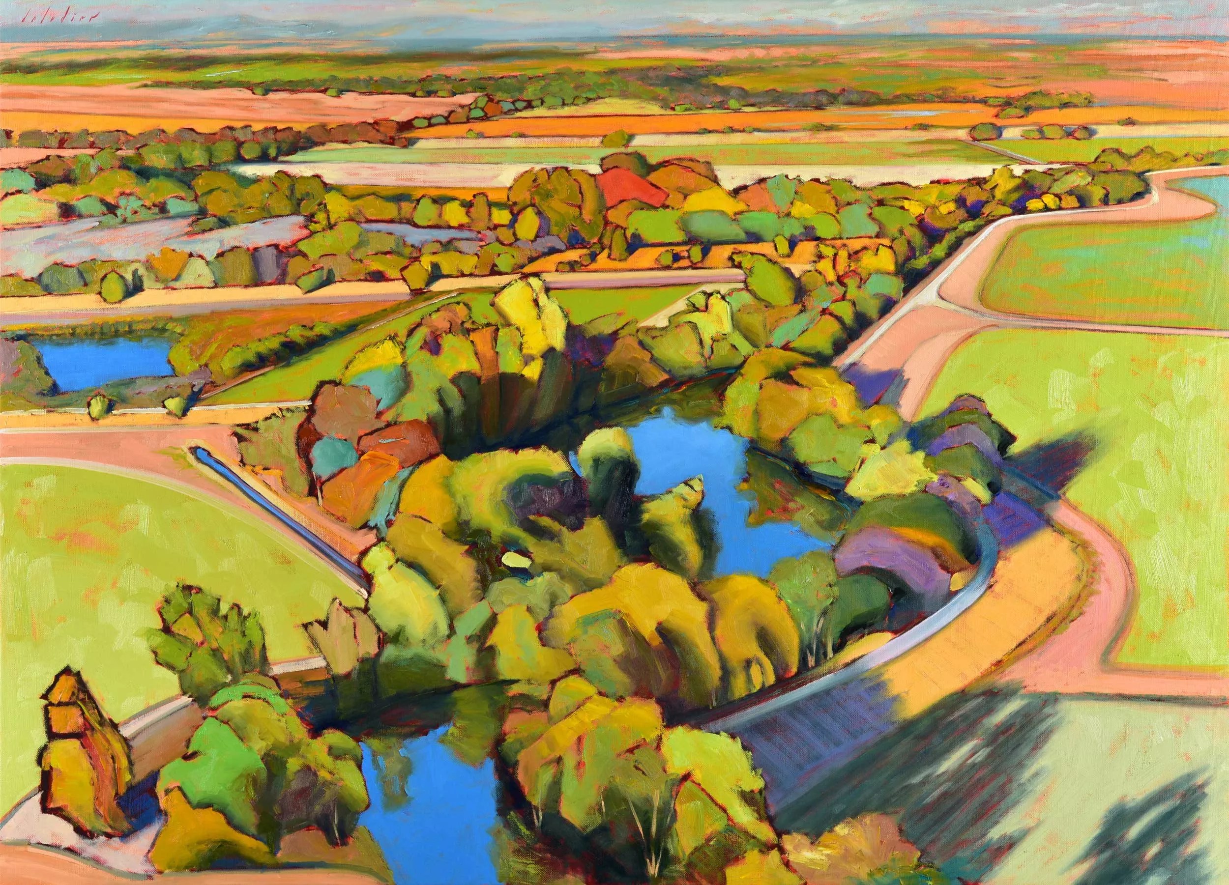 Brazilian-born artist Deladier Almeida, long based in California, brings his signature quilt-like aerial landscapes to SmithKlein for the month of July.