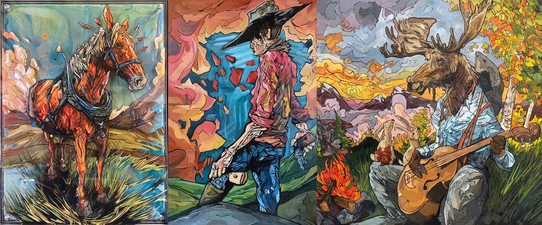 Coming soon: First Friday in person in June! While you’re waiting for tomorrow to arrive, get yourself in the artsy groove with a few aperitifs: new shows, art talks and that hopeful feeling. Cody Kuehl’s Wild West characters stand out in a crowd. Cody Kuehl