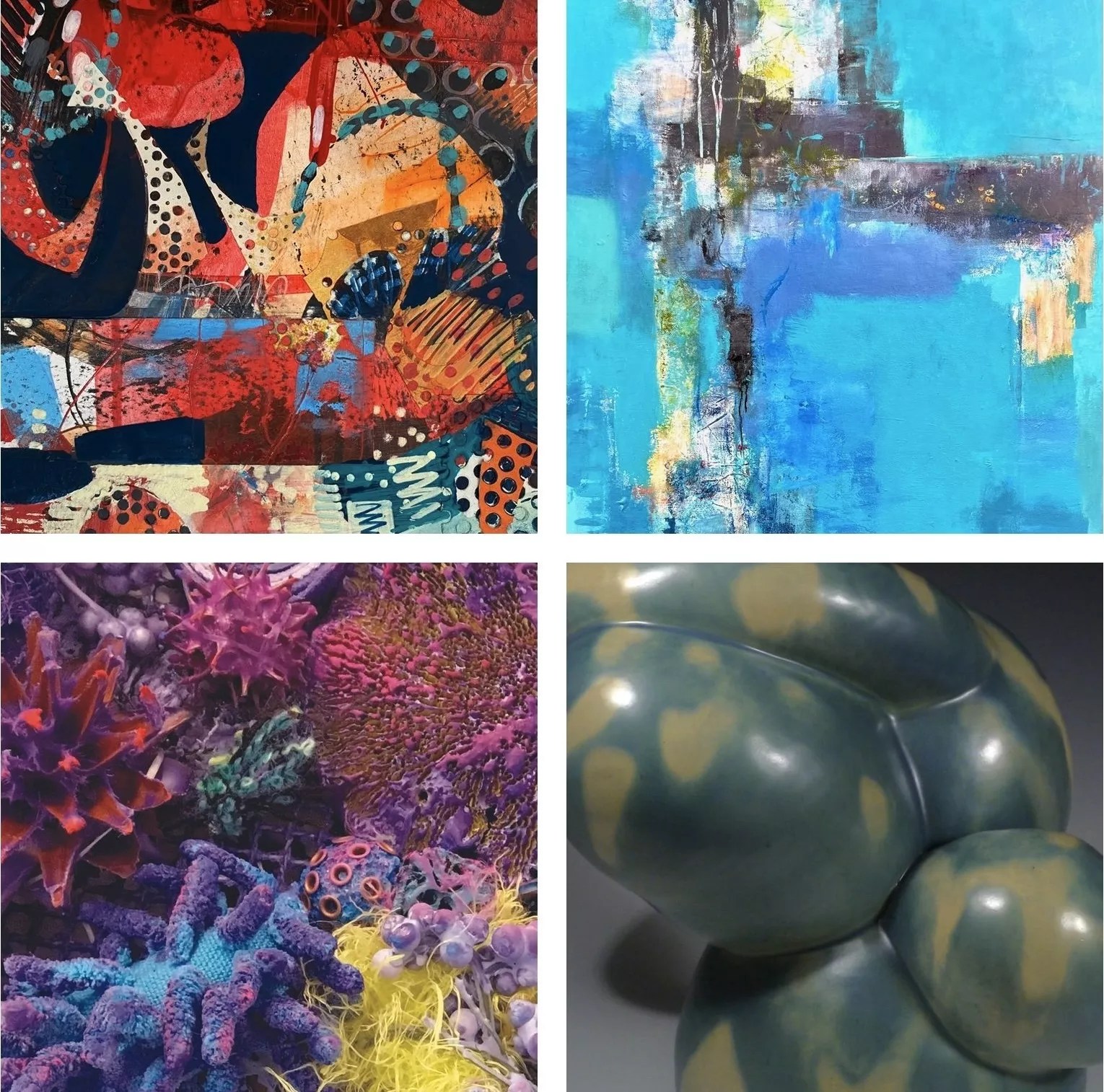 I Regret to Inform You… Rejected Public Art Detail images: L to R, upper: Emily Oldak, “Swing Time.” Laura Brenton, “Elemental.” L to R, lower: Sandi Miot, “Purple Corals.” Vicky Smith, “Dappled Light.” Courtesy D’art Gallery