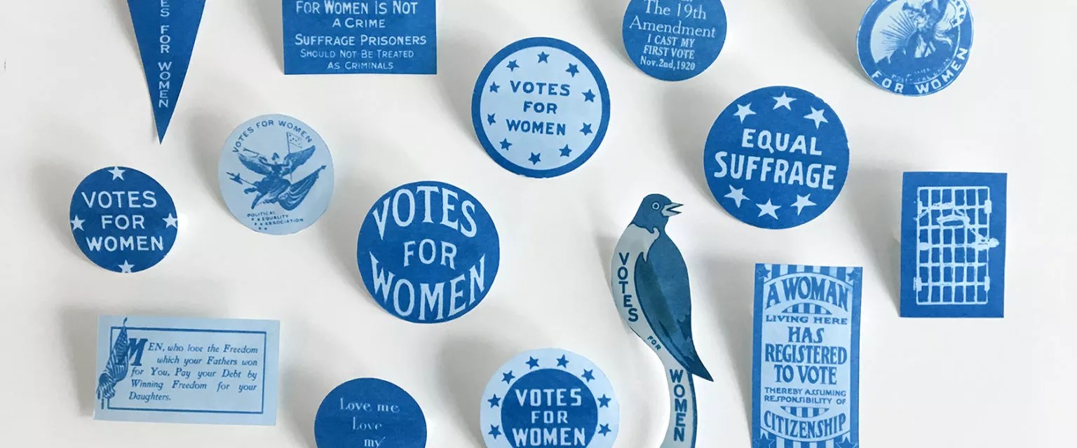 "Votes for Women 1920/2020," wearable cyanotype buttons by Lisa McCarty.