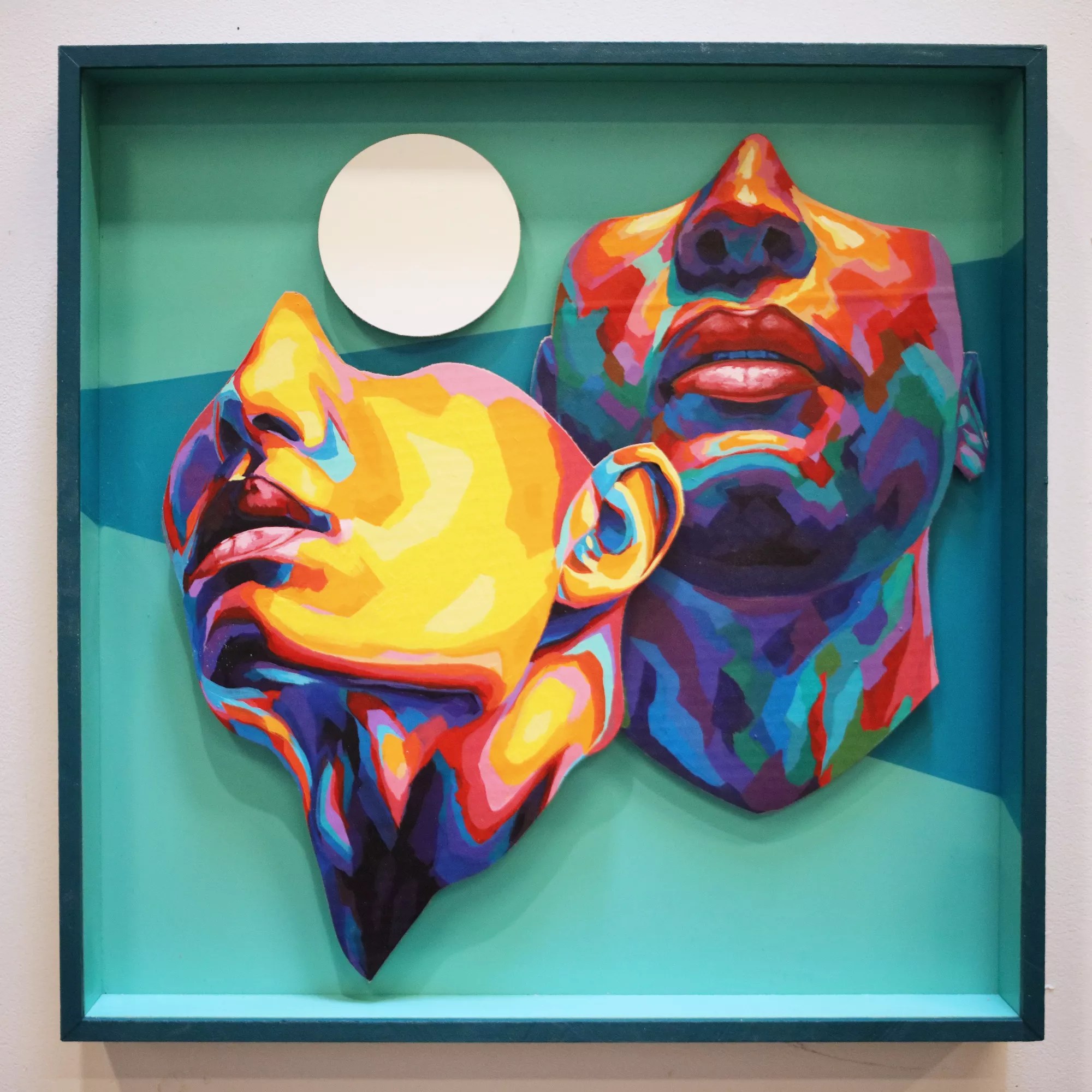 The goal is “to make it feel like this piece is made for this space,” Detour said last Thursday, looking at a wall crisscrossed with blue tape; he planned to coat the walls in colors that would complement the pieces hung on them. The art in question, housed in frames he handcrafted in the RedLine wood shop, boasts bold colors and sharp geometric lines. But the first things the eye darts to in these pieces are the lower halves of faces, painted on cardboard in a myriad of hues. These cardboard partial portraits began as a side activity as he worked on a separate, time-consuming project, says Detour, and then burgeoned into a full-blown motif. He’s drawn to these half-faces because missing the subject’s eyes gives the work a kind of anonymity, a space for viewers to invent a story, even though many of the faces actually come from reference images of friends.