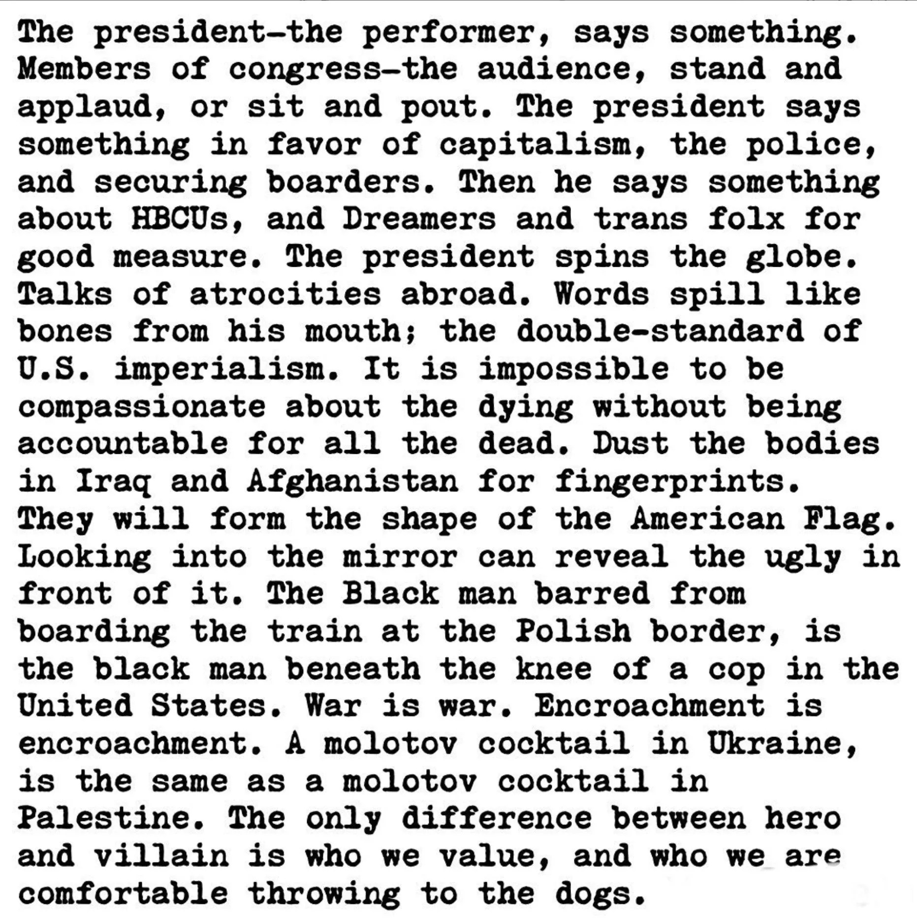 Much of his current work, according to LeFebre, is done on Instagram, and in the last week he’s posted two pieces of writing – call them micro-essays, narrative poems, whatever you like – that call out what’s going on in the world today. Specifically, the attack on Ukraine and the State of the Union address.