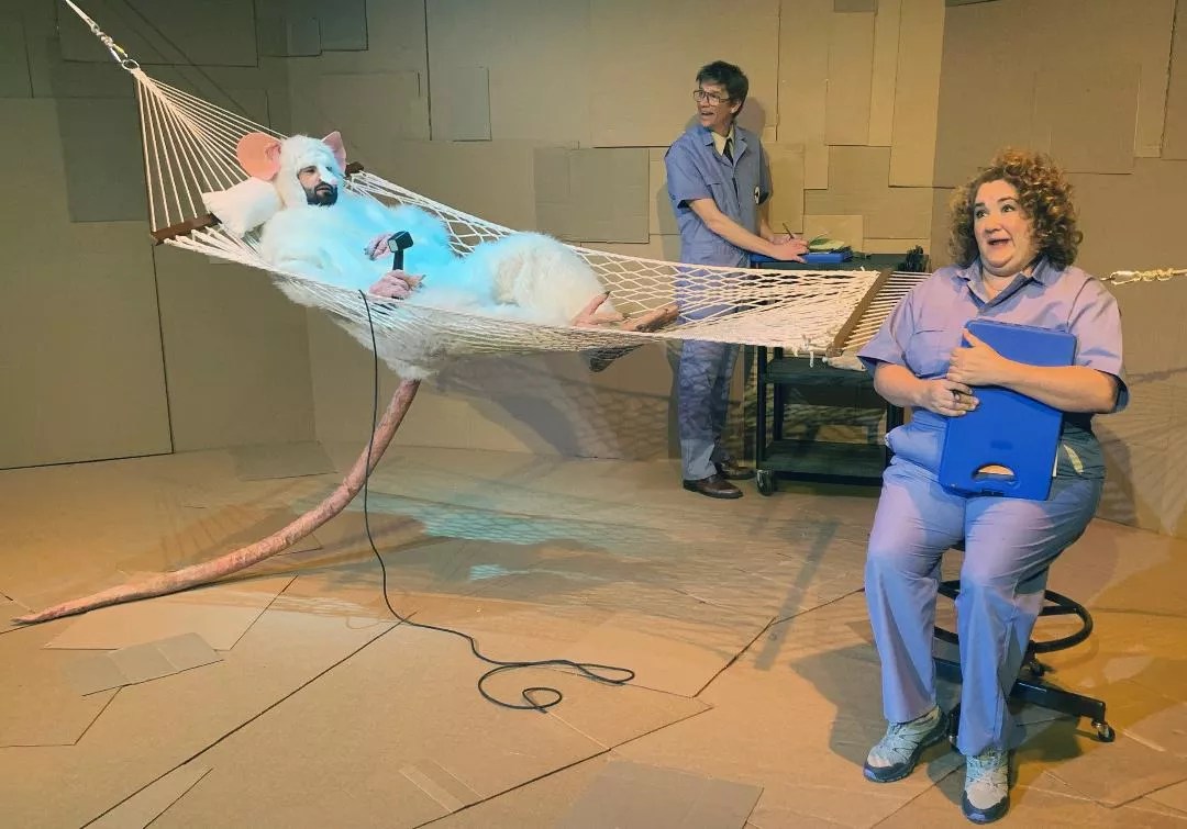 Singing mice aren’t at the core of the company’s latest offering, Universe 92, but the mysteries of animal behavior and cognition are, and there is a bit of song. The company has created a large Rat, excellently played by Colonna, who lounges in a hammock and now and then bursts – hoarsely and not at all sweetly – into outdated pop songs. Using a microphone.