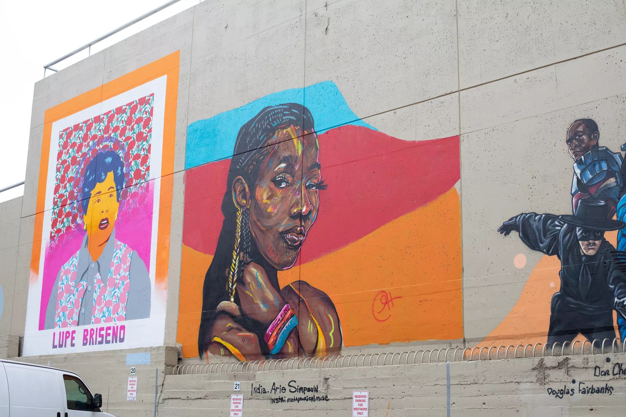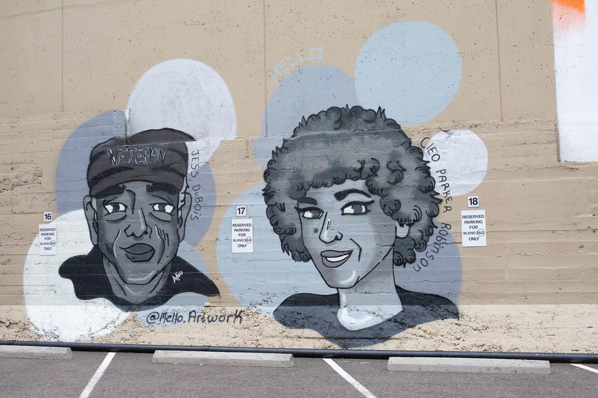 Westword members and staffers in front of indoor street art at the first meet-and-greet gathering.