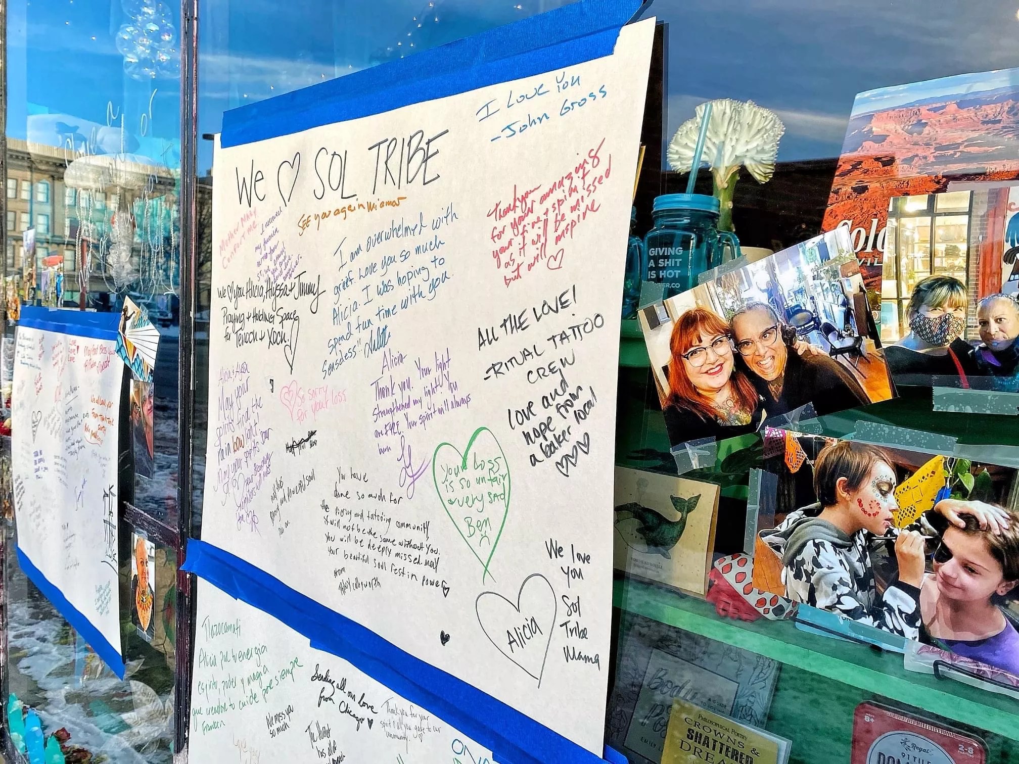 Healers, dancers, friends, family – everyone knew to come to us. I had a literal love army around me. People made sure I ate, that I drank water, that I had a physical barrier between the front door of the shop and the public. We put up posters and photos on our windows so that people could write notes to and about our friends; they kept candles going to create a space to reflect, as the giant altar in front of Sol Tribe was very overwhelming.
