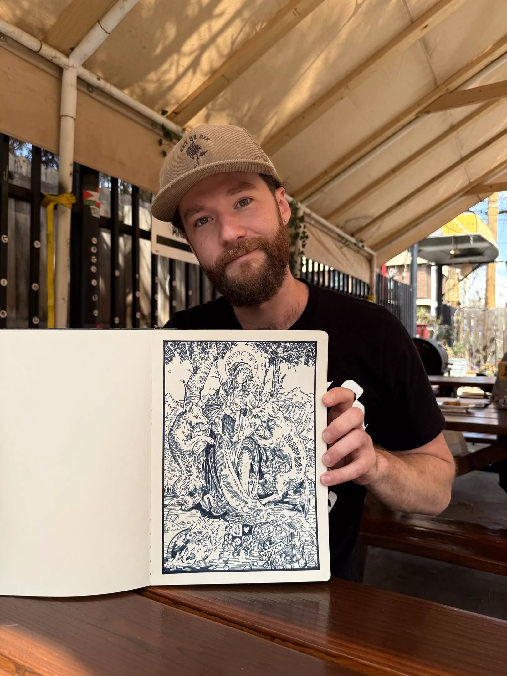 One of the first collaborative projects between Coleman and Abstract Denver was an illustration for a shirt design. “It’s ‘The Truth of Art,'” Coleman explains, holding up his sketch book. “Corporatism and Narcissism are these wolves that are attacking her. All the money is being pilfered out of her sleeves while the real problems, like the world being on fire, is just on the wayside. And we’ve come to glorify money, fame, ‘What’s in it for me,’ above the artistic truth, which is to make the world better, rebel against nothingness, to be an artist.”