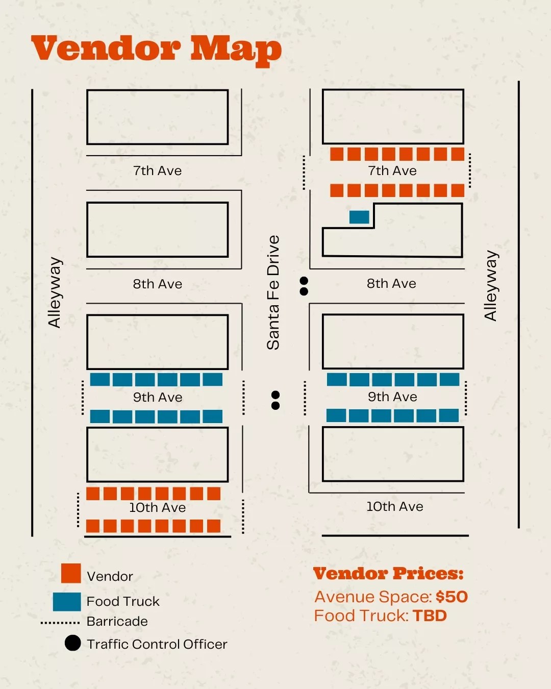 That system requires vendors to register in advance and “pay a small fee” before they’re assigned to a designated spot off Santa Fe. “7th, 9th and 10th Avenues will be closed to traffic for vendors and food trucks,” the post continues. “Santa Fe Drive will remain open to traffic. Vendors will not be allowed to set up on sidewalks along Santa Fe Drive. Sidewalk permits will be in effect to keep them clear and accessible.”