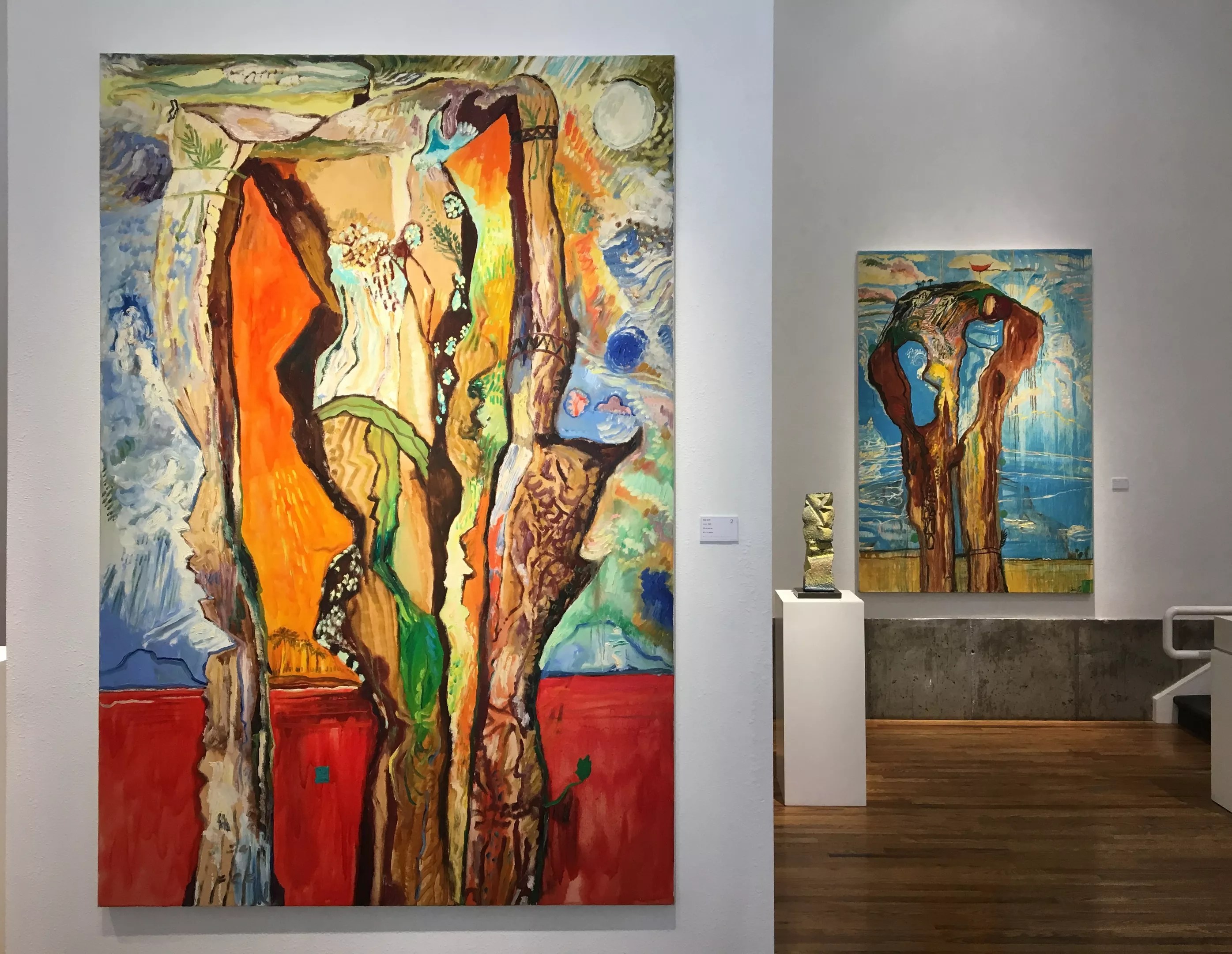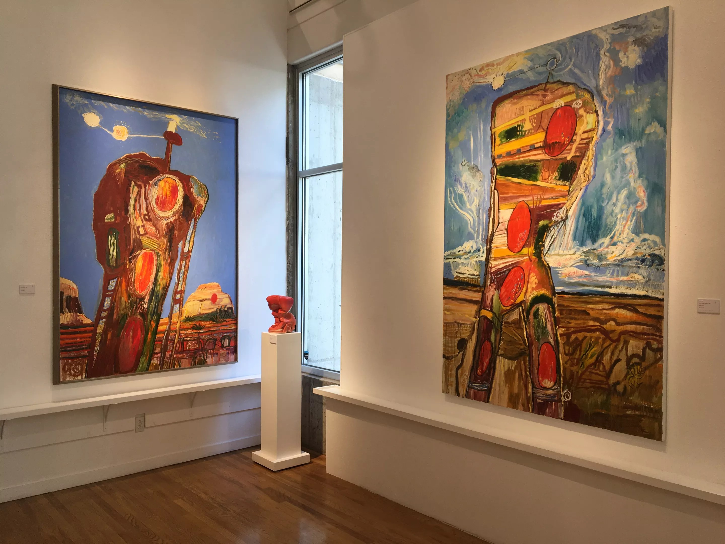 Sam Scott paintings bracket a Hank Saxe sculpture.