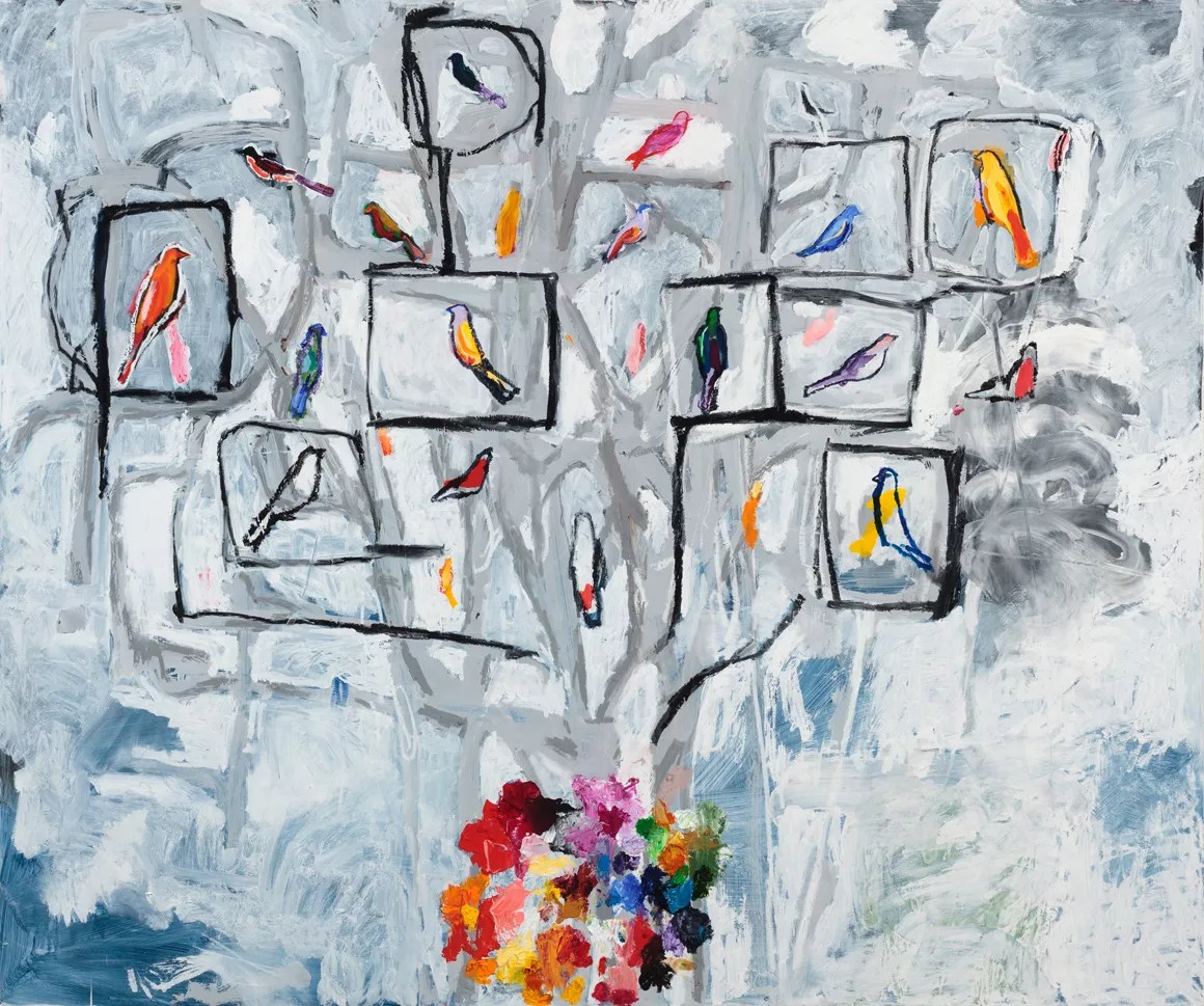 Others move further away from drawing, including the wildly expressionistic “Castor and Pollux.” In the back, the more constrained but equally exuberant “New Invasive Species” brings together multiple experimental approaches seen singly in other pieces. “New Invasive Species” depicts more than a dozen brightly colored birds perched on a ghostly rendition of a bare tree, with most of the birds contained within cage-like rectangles. The ground has been heavily worked in gray, blue and cream, with a striking cluster of colors at the base of the tree. Stockman created this effect by simply pushing the palette against the painting; as simple a gesture as that was, it really worked.