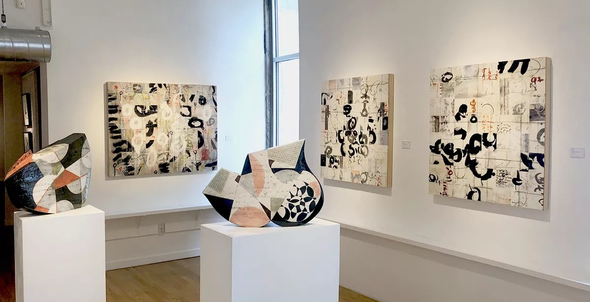 Mixed-media paintings by Laura Wait surround ceramic sculptures by Sheryl Zacharia.