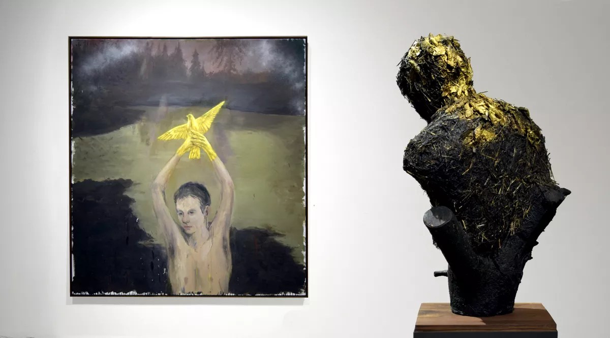 The show culminates with the pairing of the sculpture “The Traveler” with the painting “The Wager (or The Dreamer),” both among the newest pieces. The sculpture, which dates from 2016, is a bust made of wood covered in tar and straw. The painting, created last year, would seem to be celebratory, with the image of a boy with his arms up, holding a golden dove aloft in his gold-covered hands. But even this has a pall thrown over it by the expression on the boy’s face.