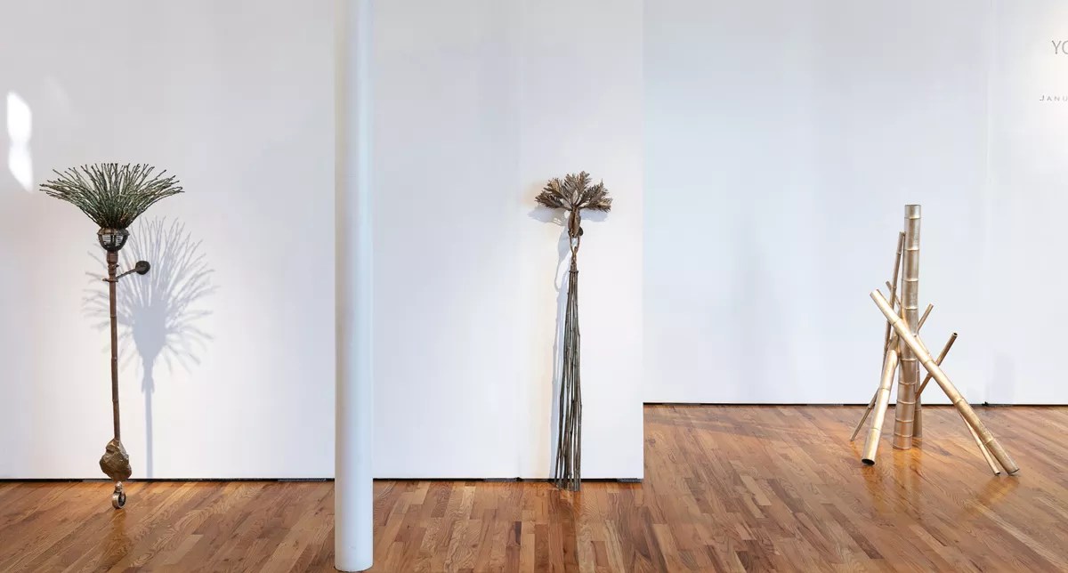Some of Saito’s sculptures have a ceremonial character – notably, “Broom” and “Little Dancer,” which are both spikes surmounted by sprays and resemble imperial court appointments. “Bamboo Gymnast,” a tent-like stack of bamboo poles cast luxuriously in gilt bronze, also has that palace quality.