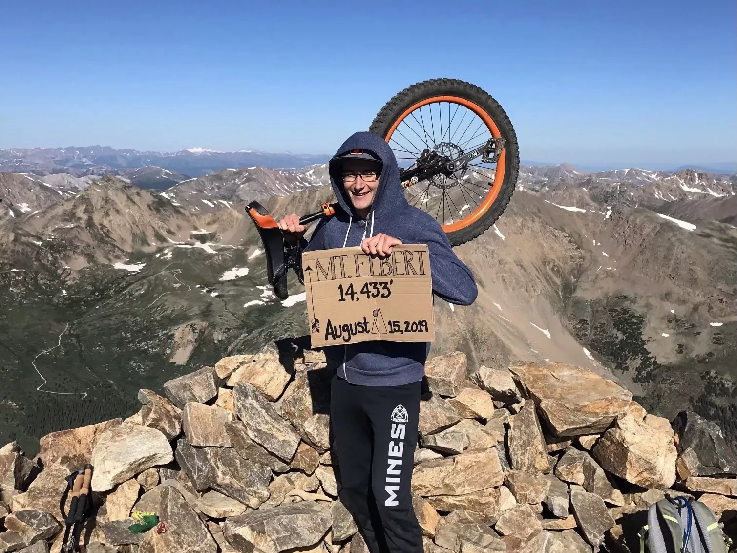 A daredevil within reason, he does leave his unicycle at home for some alpine adventures – for example, a winter ascent up Mount Sherman and a class three scramble to the top of Longs. But he hopes to bag even more Fourteeners on his unicycle – he has five for different trail conditions – and has his eyes set on San Luis Peak, as well as Handies.