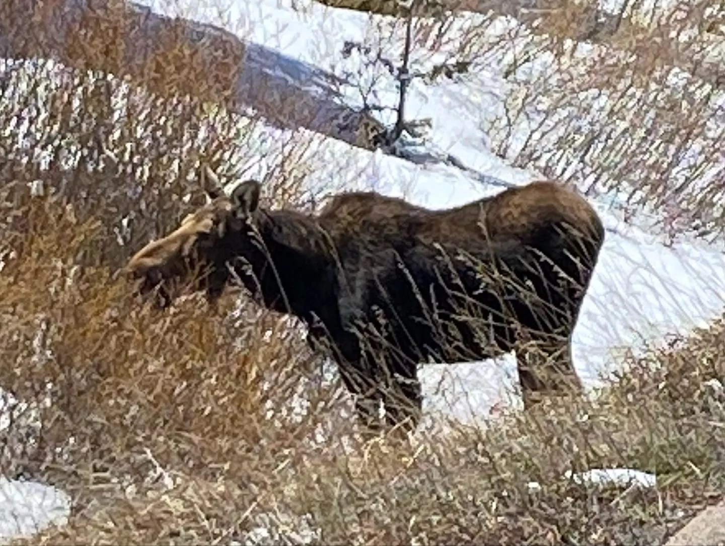 Female moose foraging on willows inside Rocky Mountain National Park.