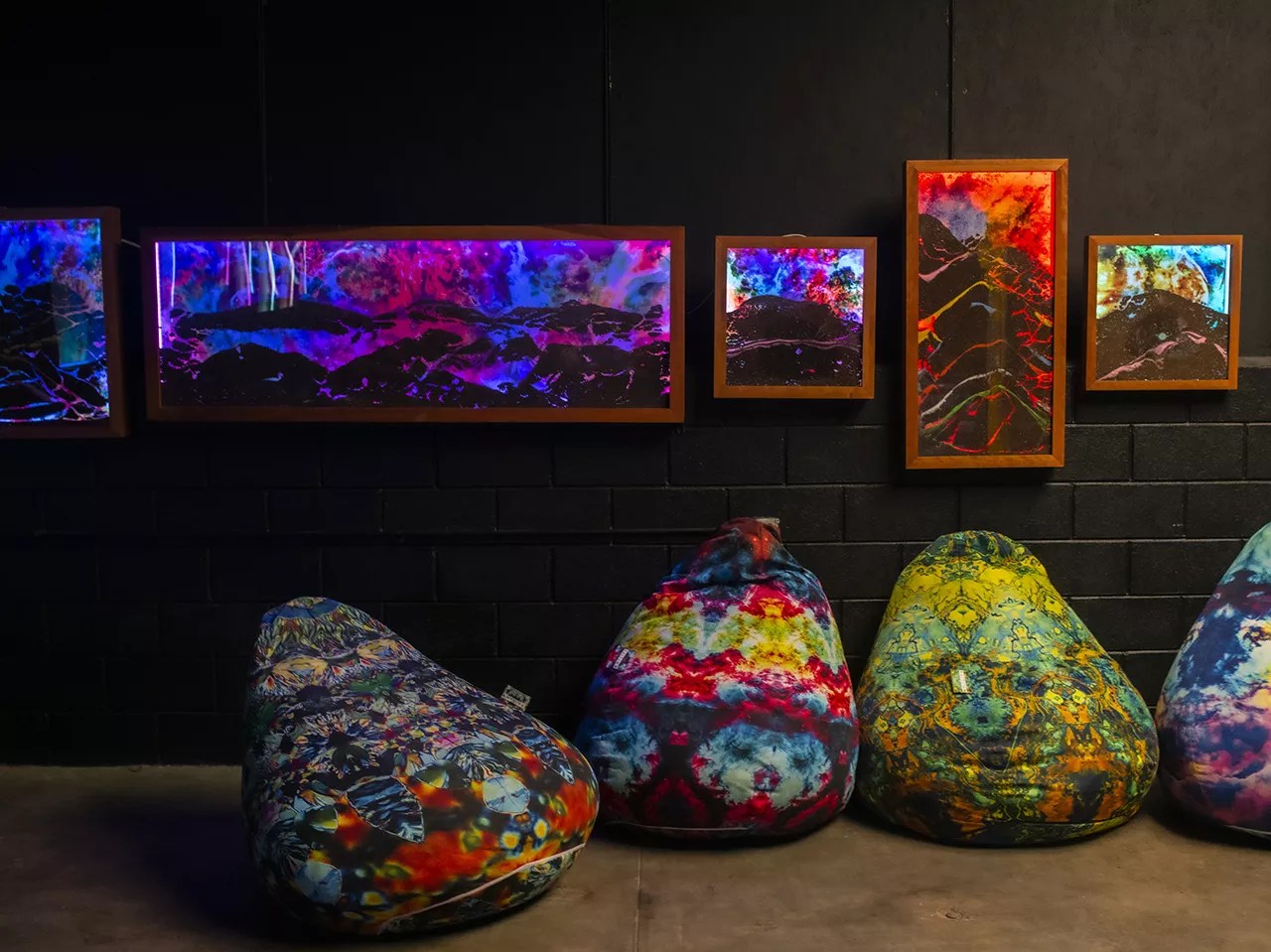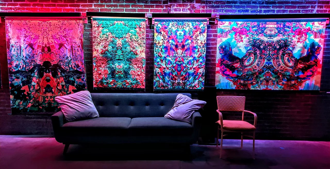 His pièce de résistance is in the back room, behind the final wall. A beanbag chair is positioned directly in front of a large, backlit, algorithm-twisted symmetric image with a color-changing light highlighting different pigments. “This is a piece I made a thousand days after my thousand-day bike ride,” he says. “After going, going, going for a thousand days, I just took a moment to reflect on what I did in the mirror time frame. And I created a place so beautiful, I was compelled to stay. And that’s what I’ve been doing: I’ve sat and looked at this for 100 hours, at least.”