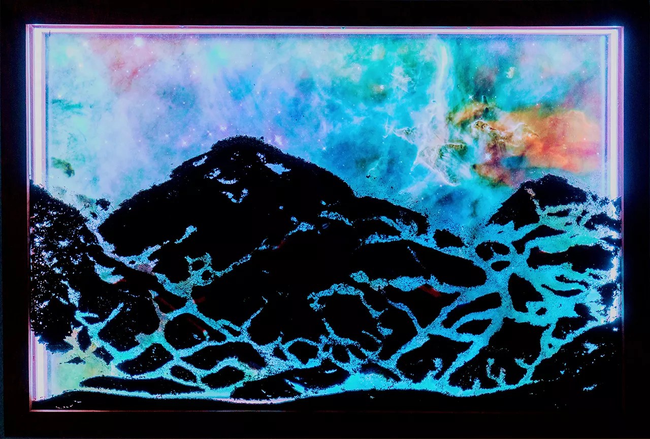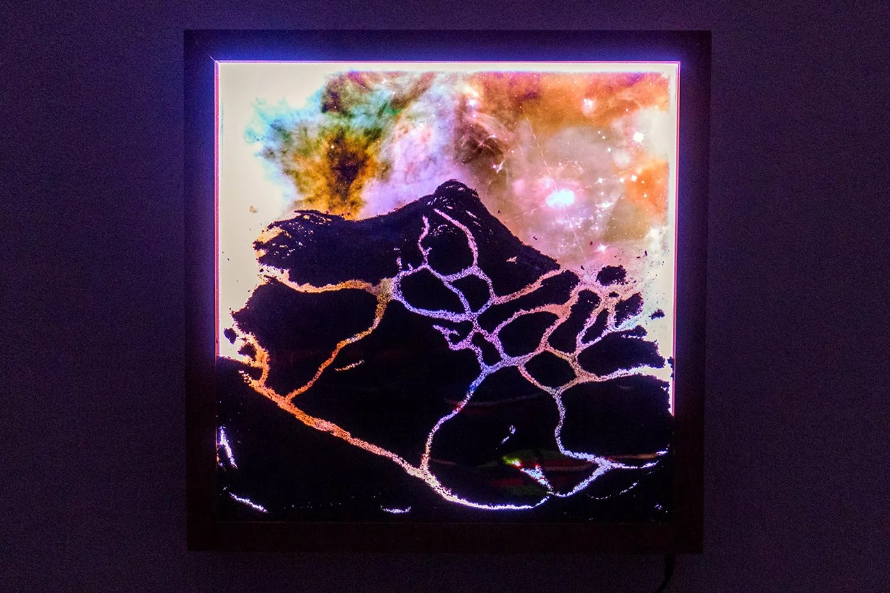 “I consider these closer to nature photography,” he says, gesturing to his space screens. “I need to go out and find it. On the far left there, that’s a photograph of a broken tree branch I took. Just to the right of that one is a satellite image from Google Earth looking down at the mountains.”