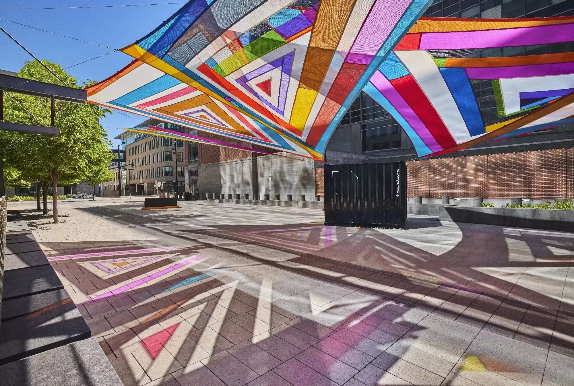 Horizon Drift, a beautiful translucent color-throwing textile installation by Rachel Hayes brought to Denver by Black Cube Nomadic Art Museum, is segueing into its final month under the sun at Plaza of the Americas. But there’s still time to enjoy its glow at a free all-ages art workshop hosted by Art Students League of Denver instructor Rhiannon Alpers, making mini versions of Horizon Drift out of translucent vellum and tissue papers. If you come with a group, collaborate and piece your triangles together for a larger piece. One last free public event – Latin Jazz in the Plaza with Mistura Fina, is scheduled for October 24 at 5 p.m; info here.